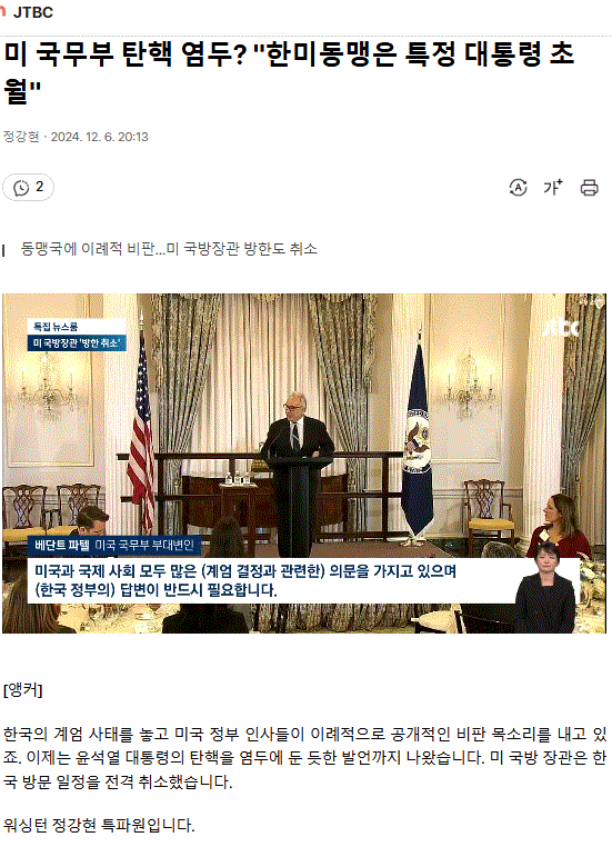 미국 국무부 부장관 "계엄선포는 심각한 오판" 강도 높게 비판 ㅡ 한국에 엄청난 댓가 탄핵