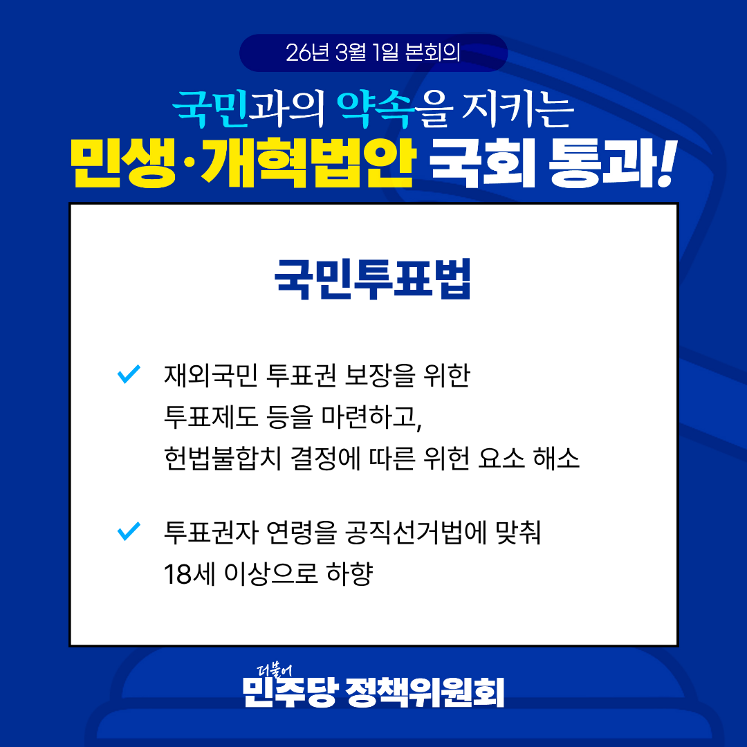 김현정 원내대변인 서면브리핑■ 늦었지만 반드시 가야 할 길, 대미투자특별법 특위 통과를 환영합니다 국회 대미투자특별법 처리를 위한 특별위원회가 「한미 전략적 투자 관리를 위한 특별법안」을 의결했습니다. 이제 대미투자특별법은 9부 능선을 넘었습니다. 어려운 논의 끝에 여기까지 온 만큼, 이제는 흔들림 없이 마무리해야 합니다. 이번 특별법 처리는 단순히 법안 하나를 처리했다는 수준의 의미에 그치지 않습니다. 여전히 대외 통상 환경은 불안정하고, 우리 기업과 산업은 관세 리스크와 공급망 불확실성에 노출돼 있습니다. 이런 때 국회가 해야 할 일은 정쟁이 아니라 국익을 지키는 입법입니다. 이번 특별법은 우리 기업이 감당해 온 불확실성의 비용을 줄이기 위한 최소한의 안전판을 마련했다는 데 의미가 큽니다. 이번 합의안은 속도만 앞세운 법이 아닙니다. 대미투자의 기본 원칙으로 상업적 합리성을 분명히 했고, 국가안보 또는 공급망 안정 등 불가피한 사유로 투자를 추진해야 할 경우에는 사전에 국회에 동의를 받도록 하기도 했습니다. 아울러 외환시장 불안 우려가 있을 경우 투자 금액과 시점 조정을 미국과 협의하도록 하는 안전장치도 담았습니다. 필요한 실행력은 확보하되, 우리 경제에 미칠 충격은 줄이기 위한 안전장치도 함께 세운 것입니다. 정부가 밝힌 대로 미국 측도 우리 국회의 신속한 처리 움직임을 긍정적으로 보고 있습니다. 결국 답은 분명합니다. 통상 불확실성을 줄이고 우리 기업의 피해를 최소화하려면, 정쟁이 아니라 책임 있는 입법으로 응답해야 합니다. 이제 3월 12일 본회의 처리만 남았습니다. 민주당은 본회의 처리까지 흔들림 없이 책임을 다하겠습니다. 국익과 민생을 지키는 책임 있는 자세로 마지막까지 최선을 다하겠습니다.2026년 3월 9일더불어민주당 공보국