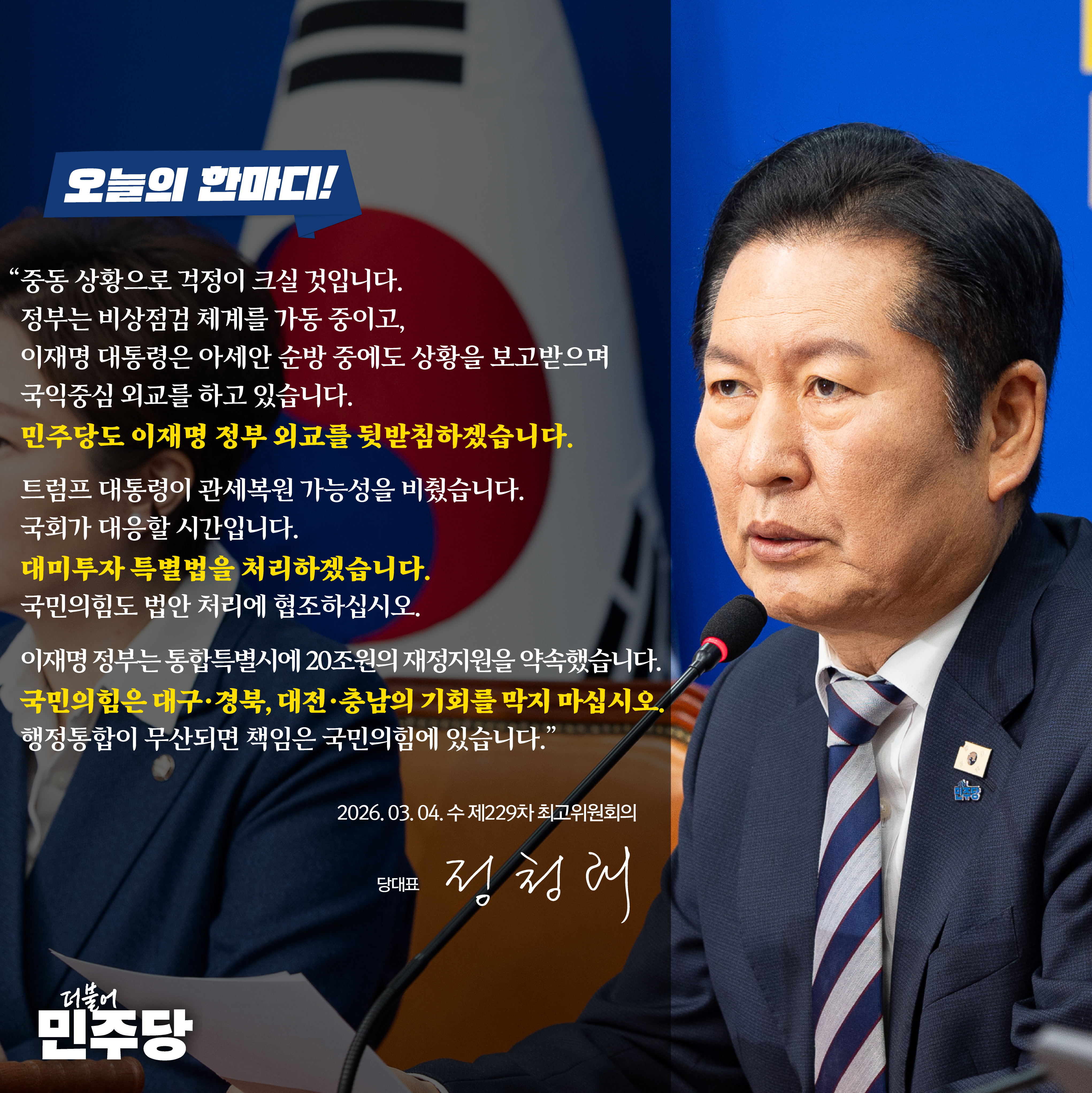 정청래 당대표, 기자회견 모두발언 □ 일시 : 2026년 3월 8일(일) 오전 11시□ 장소 : 국회 본관 당대표회의실 ■ 정청래 당대표 검찰개혁·사법개혁·언론개혁 완수! 1인1표제 실현! 지방선거 승리로 이재명정부 성공을 뒷받침하겠습니다. 존경하는 국민 여러분, 사랑하는 당원 동지 여러분, 언론인 여러분, 더불어민주당 당대표 정청래입니다. 당대표 취임 이후 두 번째 기자회견입니다. 기자회견에 앞서 이란 전쟁으로 인해 국민 여러분께서 많은 걱정이 있으실 텐데 당정청이 여러 가지 불안 요소를 잘 점검하고, 긴밀하게 잘 대처하겠습니다. 오늘은 3.8 여성의 날입니다. 축하드립니다. 저는 지난 전당대회 당시,‘강력한 개혁 당대표’의 깃발을 높이 들었습니다. 오직 당심, 오직 민심만을 믿고 오늘까지 쉼 없이 달려왔습니다. 지난 전당대회에서 「10대 혁신 공약」을 말씀드렸고, 그 공약을 지키기 위해 불철주야 노력해왔습니다. 내란과의 전쟁은 아직 끝나지 않았습니다. 이번 6.3 지방선거 승리로 내란을 청산하고 내란세력을 심판해야 합니다. 저는 윤어게인 세력들의 발호에 맞서 국민의힘이 내란을 옹호하는 반헌법, 반민주 세력임을 끊임없이 지적했고, 위헌 정당 심판의 대상이 될 수 있다는 경고를 수차례 강조했습니다. 조희대 사법부가 사법 불신의 원흉입니다. 12.3 비상계엄, 서부지법 폭동 때의 태도, 그리고 대통령 후보도 입맛에 맞게 마음대로 바꿔치기할 수 있다는 오만함이 불러온 자업자득입니다. 조희대 대법원장은 즉시 사퇴해야 합니다. 수사와 기소 분리라는 검찰개혁의 대원칙도 기회가 있을 때마다 말씀드렸습니다. 특히 추석 귀성길 라디오 뉴스에서 “검찰청은 폐지되었다, 검찰청은 역사 속으로 사라지게 되었다는 기쁜 소식을 전해드리겠다”고 약속드렸는데, 그 약속을 지킬 수 있어서 개인적으로 큰 보람을 느낍니다. 국민과 당원 그리고 이재명 대통령의 결단 덕분입니다. 감사드립니다. 저는 검찰개혁, 사법개혁, 언론개혁 뿐만 아니라 당원이 주인인 정당, 당원주권정당 실현을 위한 1인1표제를 많은 어려움 속에서도 통과시켰습니다. 나라의 주인이 국민이듯, 당의 주인은 당원입니다. 이것이 헌법 정신이고, 민주당의 당헌·당규 정신입니다. 국민주권정부 이재명정부를 성공시키기 위해 당원 주권 정당 민주당이 이번 6.3 지방선거에서 반드시 승리해야 합니다. 저는 6.3 지방선거 승리에 저의 모든 것을 걸겠습니다. 지방선거 승리에 도움이 되면 하고, 도움이 되지 않으면 안 하겠습니다. 6.3 지방선거 승리가 당 대표인 저의 지상과제입니다. 저는 지난 전당대회에서 국민과 당원께 드린 약속을 지키기 위해 열심히 노력해왔습니다. 첫째, 내란세력 척결과 검찰·사법·언론개혁 완수, 둘째, 당원주권정당 1인1표제 실현, 셋째, 4무 공천을 통한 지방선거 승리에 관한 약속이었습니다. 그 약속들을 실천하기 위해 정말 쉼 없이 달려왔습니다. 때로는 너무 빠르다는 지적도 들었고, 때로는 너무 강경하다는 말도 들었지만, 국민과 당원 앞에 공약한 약속들을 모두 다 실천해내기 위해 혼신의 노력을 다해왔습니다. 오늘은 지방선거를 앞두고 그동안의 공약 이행 성과들을 국민과 당원 앞에 보고드리면서, 지방선거 승리라는 약속을 지키고자 이 자리에 섰습니다. 먼저, 시대적 사명인 내란세력 척결과 3대 개혁 완수를 위해 매진했습니다. 저는 당대표 임기가 시작된 즉시 약속대로 검찰개혁, 언론개혁, 사법개혁 특별위원회를 가동시켰습니다. 검찰청 폐지는 권력기관 개혁의 가장 큰 상징이었습니다. 이후 지난해 12월 23일, 내란의 티끌까지도 법정에 세우기 위한 「내란전담재판부 설치법」이 통과되었습니다. 이어서 12월 24일, 허위조작정보 근절을 위한 「정보통신망법 개정안」도 처리되었습니다. 또한, 올해 1월 16일, 내란 특검, 김건희 특검, 채해병 특검의 3대 특검에서 미진했던 의혹들을 모아 집중적으로 수사하기 위한 「2차 종합 특검법」도 통과시켰습니다. 3차에 걸친 「상법」 개정을 통해 자본시장을 투명화·정상화시켰고, 코스피 5천 시대를 열렸습니다. 2월 국회에서는 법 왜곡죄 신설과 재판소원제 도입, 대법관 증원 등의 「사법개혁 3법」도 국민과의 약속대로 잘 처리되었습니다. 이번 3월 국회에서 공소청과 중수청 설치법 등 검찰개혁에 따른 「정부조직법 개정안」까지 잘 처리하고 나면, 검찰개혁, 사법개혁, 허위조작정보 근절에 관한 3대 개혁 입법 과제가 모두 일단락됩니다. 공소청법과 중수청 법안은 수사와 기소의 완전한 분리라는 대원칙이 훼손되지 않도록 하겠습니다. 검찰개혁은 이재명 정부와 민주당의 깃발이자 상징입니다. 깃발이 찢어지지 않도록, 상징이 얼룩지지 않도록 잘하겠습니다. 국민 눈높이에 맞게 원칙을 지키겠습니다. 검찰개혁이 시대적 책무임을 너무나 잘 알고 있습니다. 끝날 때까지 끝난 게 아닙니다. 끝까지 최선을 다하겠습니다. 더불어민주당이 국민의 뜨거운 여망을 받들어 차분하고 질서 있게 3대 개혁을 완수하라고지금도 많은 우려와 동시에 채찍질을 해주시는 국민 여러분과 당원 여러분들께 감사드립니다. 국민과 당원들의 검