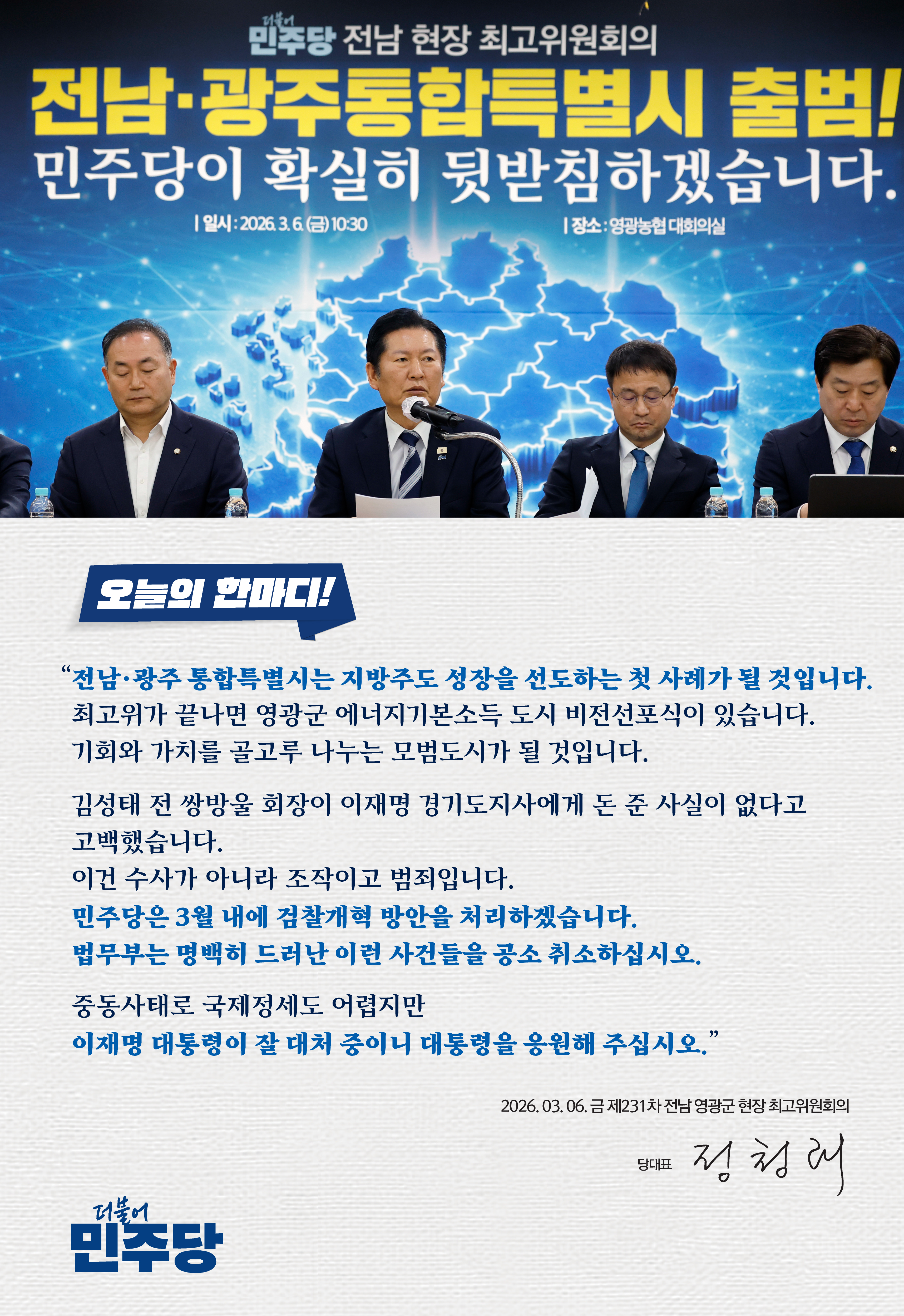 제231차 전남 영광군 현장 최고위원회의 모두발언 □ 일시 : 2026년 3월 6일(금) 오전 10시 30분□ 장소 : 영광농협 3층 대회의실 ■ 정청래 당대표 우리 전남도민 여러분 그리고 영광군민 여러분 안녕하십니까? 앞으로는 광주·전남, 전남·광주특별시민 여러분 안녕하십니까? 더불어민주당 당대표입니다. 호남에 대한 애틋한 마음, 감사한 마음으로 다시 전남 영광을 찾았습니다. 제가 당대표가 되고 나서 첫 최고위를 했던 것도 전남이고 작년 한 해를 마무리하는 마지막 현장 최고위를 한 곳도 전남입니다. 다시 전남 영광을 찾았습니다. 저는 당대표가 되고 나서 호남발전특위를 만들어서 호남에 대한 특별한 보상을 약속했고 또 그 약속을 지킬 수 있어서 저 개인적으로도 많은 보람을 느끼고 있습니다. ‘특별한 희생에는 특별한 보상을 해야 한다’는 이재명 대통령의 국정 철학을 실천, 실현할 수 있어서 민주당 당대표로서 뿌듯한 자부심도 느끼고 있습니다. 민주주의 발전에 호남이 기여한 바가 큰데 호남 발전에는 국가가 무엇을 기여했는가라는 질문에 답해야 된다고 저는 늘상 말했고 그것을 호남발전특위를 통해서 호남에 많은 예산을 배정했고 호남 발전에 기여할 수 있는 예산 편성이 실현되면 우리 호남에 계시는 분들이 눈과 피부로 느낄 수 있을 것이라 생각합니다. 거기에 더해 기쁨 두 배라고 광주·전남, 전남·광주통합법이 국회를 통과하고 어제 국무회의를 통해서 확정됨으로써 호남 발전에 또 하나의 토대를 마련했다는 점에서 기쁨이 두 배가 아닐 수 없습니다. 호남의 기쁨이 민주당의 기쁨입니다. 여러분 여기서 박수 한번 보내주시죠. 이번 특별법 통과로 만들어질 전남·광주 통합특별시는 서울특별시에 준하는 지위를 갖게 됨으로써 대한민국 지방 주도 성장을 선도하는 첫 사례가 될 것입니다. 4년간 20조 원 수준의 지원으로 재정은 보다 튼튼해지고 공공기관 이전과 산업 활성화로 전남·광주의 위상을 드높일 것입니다. 농업 스마트 혁신과 미래 첨단 산업의 글로벌 거점으로 자리 잡게 될 것입니다. 국토 균형발전의 심장이고 엔진이 될 것입니다. 호남은 민주주의의 상징이었는데 앞으로는 국토 균형 발전의 심장이 될 것입니다. 오늘 최고위원회가 끝나면 영광군 에너지 기본소득도시 비전 선포식이 있을 예정입니다. 우리 이재명 대통령께서 후보 때부터 항상 말씀하셨던 햇빛 연금, 에너지 연금, 바람 연금을 실천하는 현장이 바로 이곳 영광이 되었으면 좋겠습니다. 대한민국 에너지 전환을 주도할 전남·광주와 영광의 출발을 오늘 영광에서 시작했으면 좋겠습니다. 영광은 지난 영광군수 재보궐 선거 때 제가 여기를 하도 많이 와서 제 지역구에 온 것 같습니다. 영광터미널 시장 사장님들 지금 눈에 선합니다. 그리고 백수읍 경로당 어르신들, 홍농읍 가게 사장님, 영광터미널 앞에 택시기사님들 그리고 그랜드 미용실 원장님 제가 이름까지 아는데 이름은 얘기 안 하겠습니다. 그리고 낙월도 이분은 그냥 이름 얘기하겠습니다. 장철진 어촌 계장님하고도 통화를 했습니다. 그만큼 영광은 고향에 온 것 같은 따뜻한 품 같은 느낌이 듭니다. 우리 박지원 어르신하고도 그때 열심히 많이 다녔는데 감회가 참 새롭습니다. 이곳 영광에서 에너지 기본 소득이 본격화되면 지역의 재생에너지 발전으로 얻은 수익을 군민들이 나눠 갖게 됩니다. 영광은 이재명 대통령께서 말한 기회와 과실을 골고루 나누는 모두의 성장을 지향하는 모범 도시가 될 것입니다. 특별한 희생에 특별한 보상을 드리겠다고 했던 이재명 정부와 함께 호남, 전남 발전을 위해 최선을 다하겠습니다. 도민 여러분 앞에 약속드렸던 하나하나를 민주당이 지켜 나가겠습니다. 행정 통합으로 전남·광주가 대한민국의 든든한 지방 거점이 되고 명실상부한 에너지 전환 수도로 자리 잡을 수 있도록 민주당이 끝까지 챙기겠습니다. 그리고 행정통합 이야기가 나온 김에 말씀드립니다. 충남·대전, 대전·충남, 대구·경북 통합 문제도 우리가 속 시원하게 통과시키고 처리하고 싶었습니다. 그런데 국민의힘에서 먼저 주장하고 행정 절차도 밟았던 충남·대전 통합에 대해서 아시다시피 반대하고 나서고 대구·경북은 국민의힘 내부에서 자중지란이 일어나고 찬반에 오락가락하고 하는 바람에 실현되지 않고 있습니다. 이들 두 지역에 대한 통합이 무산된다면 그것은 200% 국민의힘 책임이라는 것을 다시 한 번 말씀드립니다. 여러분 며칠 동안 제가 밤잠을 이룰 수 없을 정도로 분노한 사건이 또 불거졌습니다. 검찰의 조작 기소 때문입니다. 검찰의 추악한 민낯이 명백히 드러났습니다. 최근 언론보도에 따르면 김성태 전 쌍방울 회장이 지인에게 ‘이재명 경기도지사에게 돈을 준 사실이 없다’고 고백한 사실이 밝혀졌습니다. 심지어 김 전 회장은 해당 녹취록에서 ‘뭐가 있어야 내놓지 검찰이 자꾸 내놓으라고 한다’며 검찰의 진술 압박까지 토로한 것이 드러났습니다. 이것은 검찰이 날강도짓보다 더한 짓을 한 겁니다. 이 부분에 대해서 민주당은 절대 좌시하지 않고 그냥 넘어가지 않겠습니다. 죄를 지은 만큼 죗값을 치르게 하