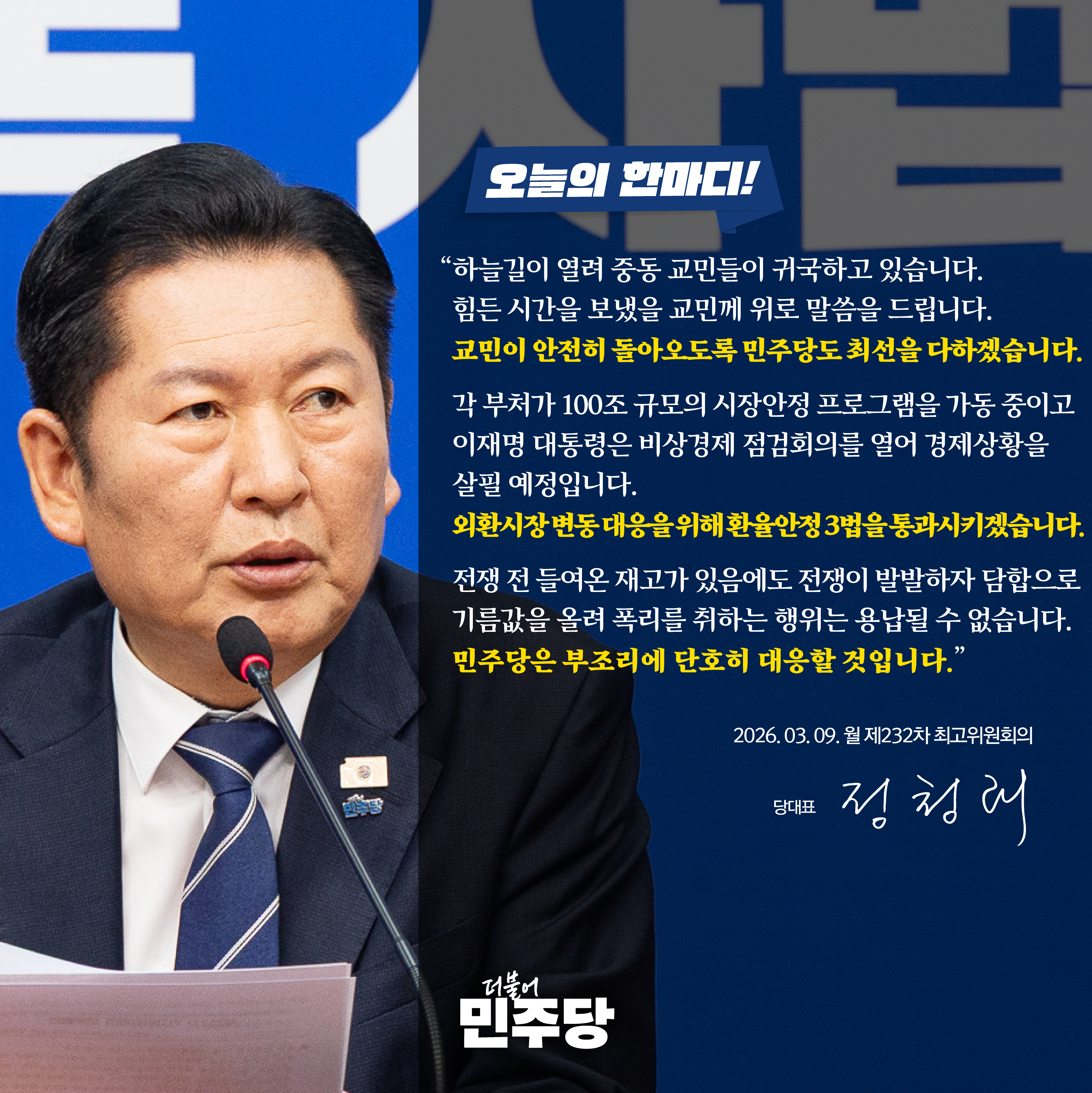 제232차 최고위원회의 모두발언 □ 일시 : 2026년 3월 9일(월) 오전 9시 30분□ 장소 : 국회 본관 당대표회의실 ■ 정청래 당대표 중동 전쟁으로 인해 국제 사회의 긴장이 고조되고 있습니다. 우리 국민의 안전, 생명보다 더 고귀한 것은 없습니다. 다행히 하늘길이 열리면서, 중동 지역에 머물던 교민들이 속속 귀국하고 있습니다. 오늘 새벽, 억류되어 있던 교민들이 정부가 마련한 추가 전세기를 통해 무사히 고국 땅을 밟았습니다. 힘든 시간을 보내셨을 교민 여러분께 깊은 위로의 말씀을 드립니다. 귀국을 희망하는 모든 교민들이 안전히 돌아올 수 있도록, 민주당도 정부와 함께 끝까지 최선을 다하겠습니다. 국제 유가와 환율 상승 등으로, 경제 상황 또한 매우 엄중합니다. 각 부처가 100조 규모의 시장 안정 프로그램을 가동하고 있고, 이재명 대통령은 오늘 비상경제점검회의를 열어 경제, 물가 상황을 살필 예정입니다. 또한 당정은 외환시장 변동성에 대응하기 위해 ‘환율 안정 3법’을 조속히 처리하기로 뜻을 모았습니다. 19일 본회의 통과를 목표로, 속도를 내겠습니다. 앞으로도 당정청은 중동 상황 여파를 면밀히 점검하고 대책을 세우겠습니다. 신속하고 긴밀한 대응으로, 국민 여러분의 걱정을 덜어드리겠습니다. 그런데 국가적 위기를 틈타 피해를 국민에게 떠넘기며 부당 이익을 취하려 한다면, 이는 이재명 대통령 말씀대로 대국민 중대 범죄입니다. 유가 변동이 주유소 가격에 반영되기까지 통상 2~3주의 시간이 걸립니다. 그러나 전쟁 전 들여온 재고가 있음에도, 전쟁이 발발하자마자 담합과 가격 조작으로 기름값을 올려 폭리를 취하는 행위는 용납될 수 없습니다. 민주당은 정부와 힘을 모아 부조리에 단호히 대응할 것입니다. 유가 불안으로부터 국민의 삶을 지켜내겠습니다. 또 하나의 천인공노할 사실이 밝혀졌습니다. 범인을 취조해야 할 검사실이 검경 유착의 본거지였음이 드러나고 있습니다. 검찰의 ‘사전 각본’이 드러난 김성태 녹취록도 모자라, 구치소에 수감 중이던 김성태 쌍방을 전 회장이 검사실을 집무실처럼 이용했다는 것이 법무부 특별점검으로 밝혀지고 있습니다. 2023년 2월 23일과 5월 15일, 김성태 구치소 면회 녹취록에 따르면, 검사실에서 피의자 김성태가 업계 지인과 쌍방울 그룹 고문을 면담했다는 의혹입니다. 계열사 대표이사를 만나 주주총회 관련 업무 지시와 회의도 했다는 의혹입니다. 정말 의혹이었으면 좋겠습니다. 그러나 이것이 사실로 드러난다면 진짜 큰 문제입니다. 수용 질서 위반과 수사 준칙을 어겼다는 것도 큰 문제지만, 검사와 피의자 사이의 유착이 무엇을 거래하며 이뤄졌는가를 생각하지 않을 수 없습니다. 이미 녹취록을 통해 김 전 회장이 지인에게 ‘이재명 경기도지사에게 돈을 준 사실이 없다’고 고백한 사실이 밝혀진 상황입니다. 누구라도 거래의 내용을 짐작할 수 있습니다. 검사는 ‘돈을 주었다고 진술하라’고 요구하고, 김성태가 ‘그러겠다’고 대답함으로써 말도 안 되는 특혜가 이뤄졌다는 의심을 지울 수가 없습니다. 쌍방울 대북 송금 사건이 명백한 조작이었음이 다시금 확인되는 것 아닙니까? 검찰이 사법을 남용하고 공권력을 사유화하여 벌인 조작이었음이 의심할 수 없는 사실로 굳어지고 있습니다. 1313호 검사실은 술 파티에 이어 조작과 유착, 특혜로 얼룩진 악령의 도가니로 기록될 것 같습니다. 법을 왜곡한 조작은 날강도보다 더한 살인행위입니다. 한 사람의 인생을 몰락시킬 뿐 아니라 가족, 국가 전체에 가장 못된 짓을 저지르는 행위입니다. 민주당은 절대 좌시하지 않고 그냥 넘어가지 않겠습니다. 법으로 법을 지키겠습니다. 국정조사를 추진해 조작검사의 민낯을 샅샅이 보여드리겠습니다. 부당한 공소는 취소시키겠습니다. 조작 기소에 가담한 책임자를 처벌함으로써 정치검찰이 다시는 사법체계에 발을 들이지 못하도록 하겠습니다. 이제 7개월 뒤에 검찰 조직은 역사 속으로 사라집니다. 국민의 눈높이에 맞게 반드시 검찰 개혁을 완수하겠습니다. 오늘로 지방선거가 정확히 86일 남았습니다. 어제 기자회견에서 말씀드렸듯이, 이번 지방선거에서 반드시 압승하여 내란세력을 심판, 청산하고, 이재명 정부의 성공을 든든하게 뒷받침하겠습니다. 이번 지방선거 공천의 대원칙이자, 승리의 비책은 바로 ‘4무(無), 4강(强) 공천’입니다. 억울한 컷오프 없고, 부적격자 공천 없고, 낙하산 공천 없고, 부정부패 없는 4무 공천을 통해 가장 경쟁력 있는 후보를 뽑아내겠습니다. 동시에 가장 민주적인 시스템 공천, 가장 공정한 당원 주권 공천, 가장 투명한 열린 공천, 가장 빠른 공천이라는 4강 원칙으로 모두가 결과에 깨끗이 승복하는 경선을 만들어내겠습니다. 현재 더불어민주당의 공천 사무는 4무, 4강 원칙에 따라 정해진 절차대로 한 치의 오차 없이 가동하고 있습니다. 역사상 가장 빠른 공천을 통해 우리 후보들이 현장에서 한 발짝이라도 더 뛸 수 있도록 승리의 기틀을 조기에 갖추겠습니다. 65%에 이르는 이재명 대통령의 높은 지지율은 국민께서 정부의 성과를 피부로 체감하고 계시다는 명백한 증거입니다. 더불