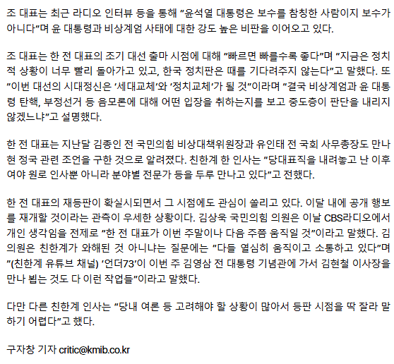 [단독] 한동훈, 조갑제·김종인·유인태 릴레이 회동… 재등판 임박?
