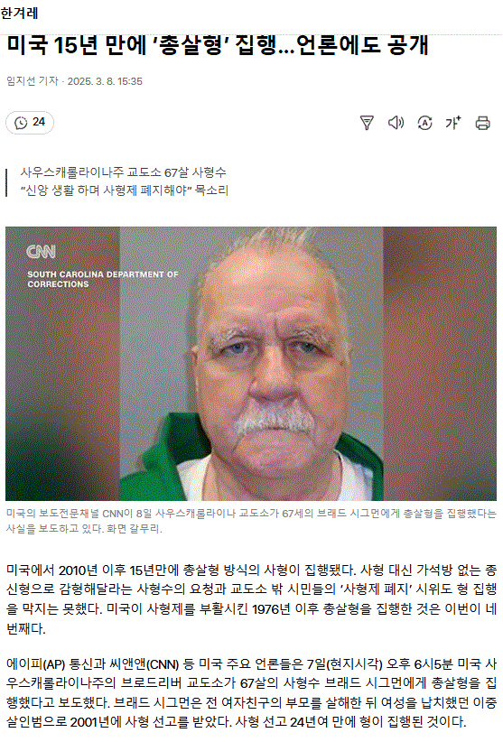 미국 15년 만에 ‘총살형’ 집행… 언론에도 공개