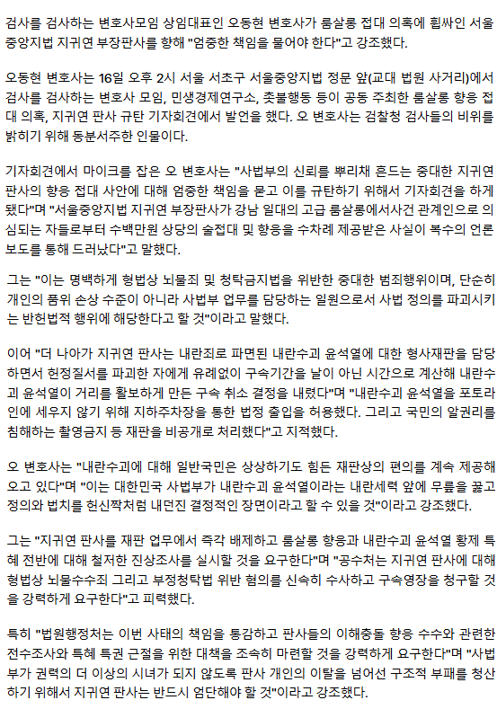 오동현 변호사 "지 판사 향응 접대 의혹, 사법부 신뢰 뿌리채 흔들어"