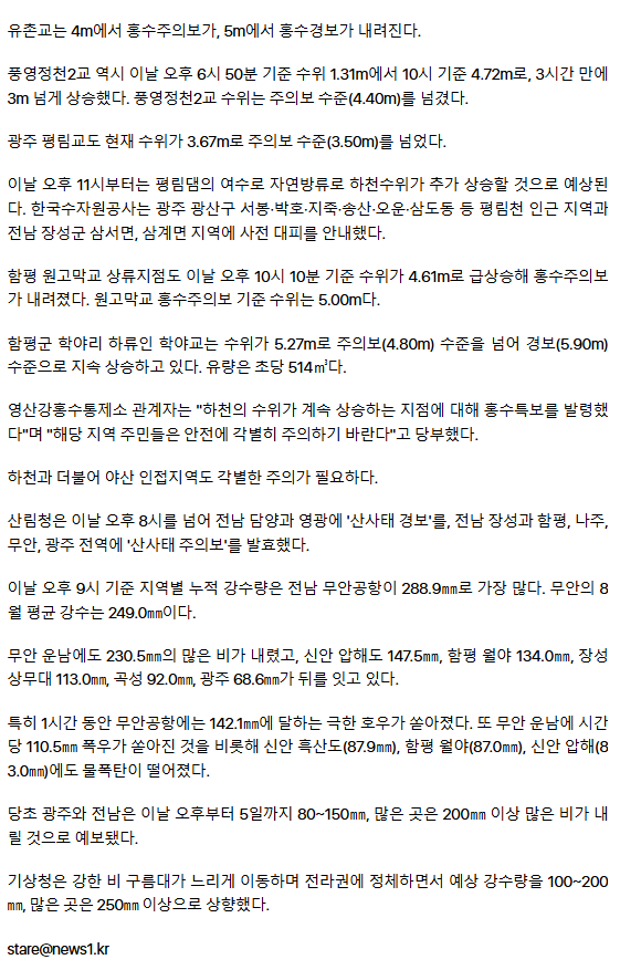 '288㎜ 물폭탄' 광주 유촌·평림·함평 학야 등 5곳 '홍수특보' (종합)