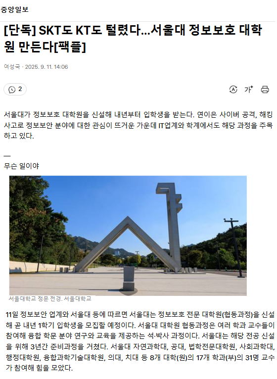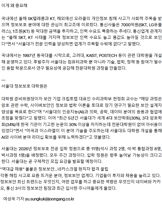 [단독] SKT도 KT도 털렸다… 서울대 정보보호 대학원 만든다 [팩플]