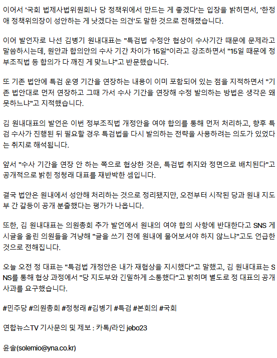 [단독] 정청래 "원내서 만들지 말라"… 김병기 "15일 때문에 합의 깼나"ㅡ 싸우지 마라 꼴사납다