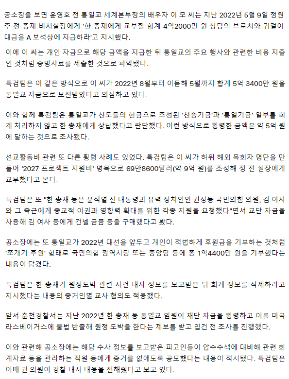 "한학자, 보석·명품 구입하려 5억 횡령"… 특검, 공소장 적시