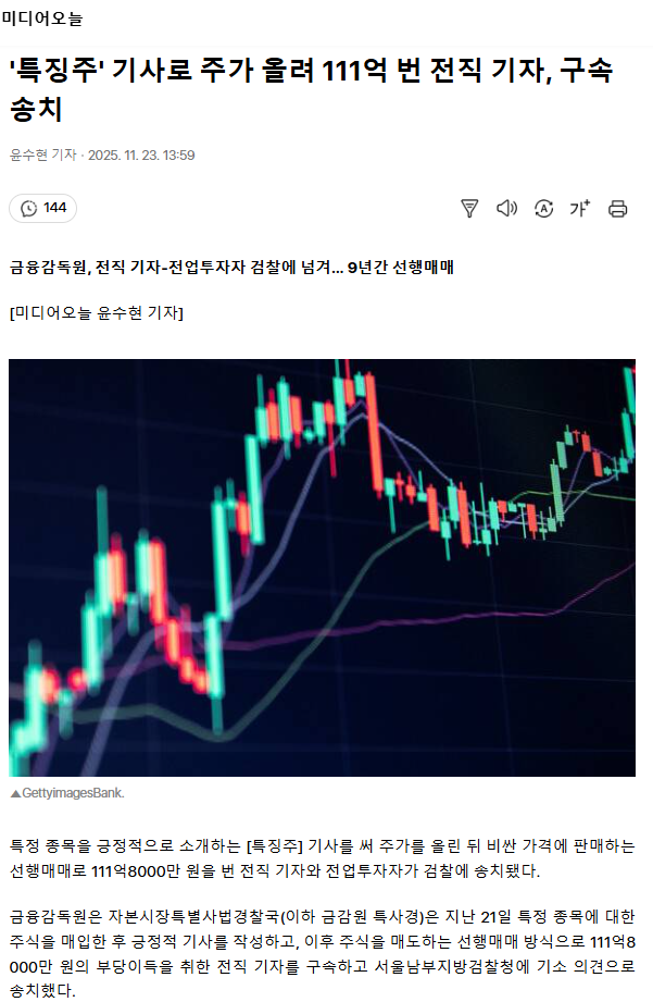 '특징주' 기사로 주가 올려 111억 번 전직 기자, 구속 송치