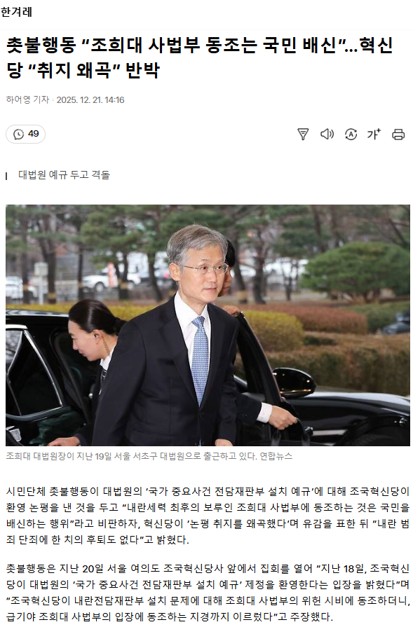 촛불행동 “조희대 사법부 동조는 국민 배신”… 혁신당 “취지 왜곡” 반박