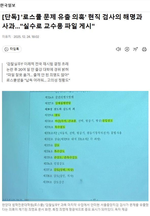 [단독] '로스쿨 문제 유출 의혹' 현직 검사의 해명과 사과… "실수로 교수용 파일 게시" ㅡ 안미현검사