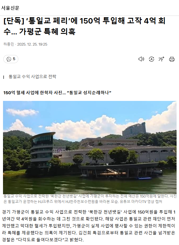 [단독] ‘통일교 페리’에 150억 투입해 고작 4억 회수… 가평군 특혜 의혹