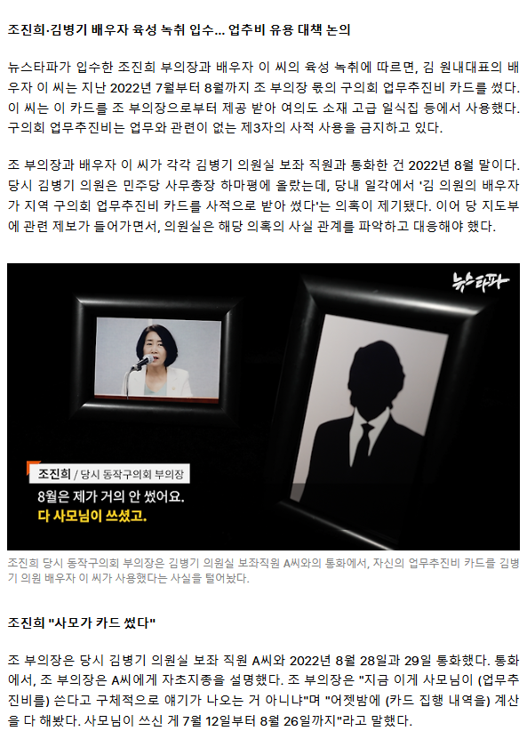 “사모가 썼다”… '김병기 배우자 업추비 유용' 자백 녹취 공개 ㅡ 부부가 범죄 연루 의혹