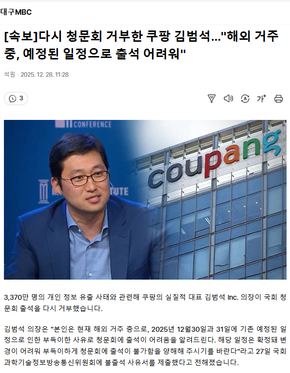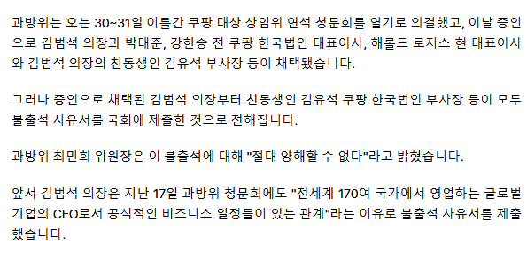 [속보] 다시 청문회 거부한 쿠팡 김범석… "해외 거주 중, 예정된 일정으로 출석 어려워"ㅡ 멍멍이소리