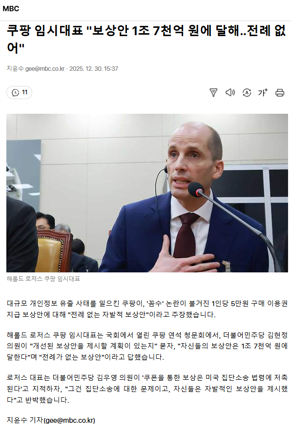 쿠팡 임시대표 "보상안 1조 7천억 원에 달해‥전례 없어"ㅡ 꼼수 부리는 쿠팡 대표