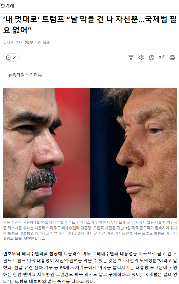 ‘내 멋대로’ 트럼프 “날 막을 건 나 자신뿐… 국제법 필요 없어”