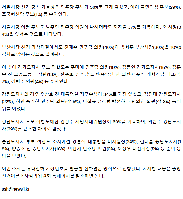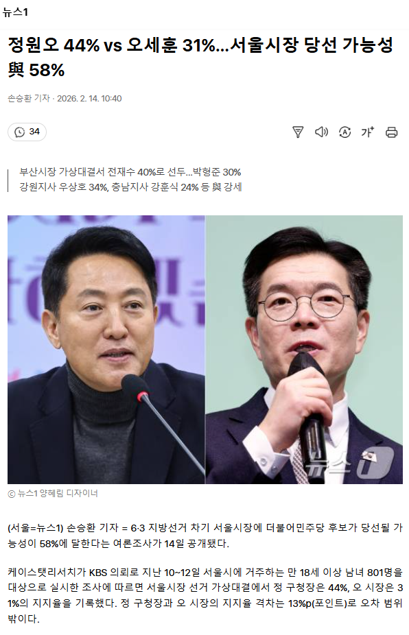 정원오 44% vs 오세훈 31%… 서울시장 당선 가능성 與 58%