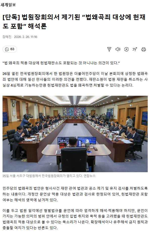 [단독] 법원장회의서 제기된 “법왜곡죄 대상에 헌재도 포함” 해석론