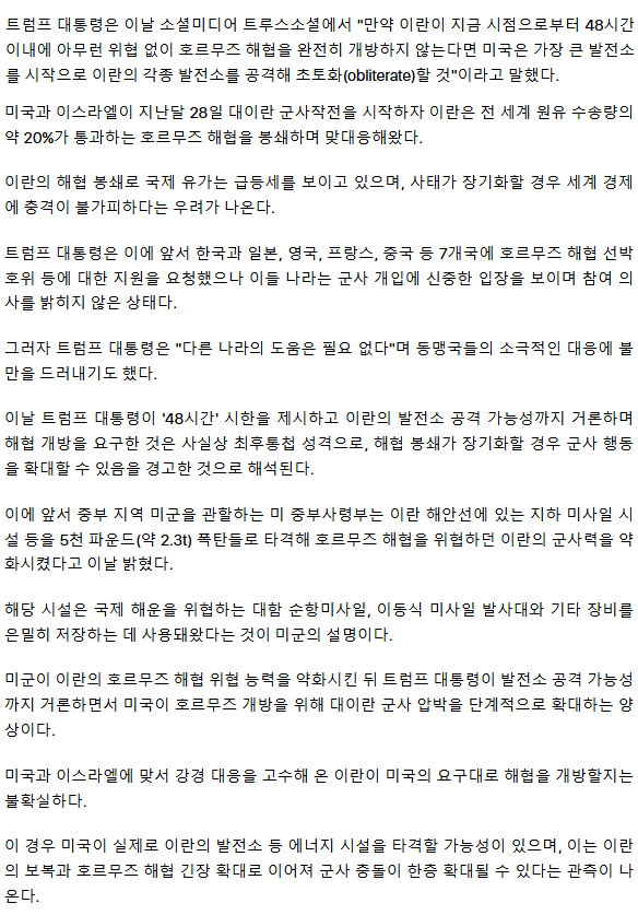 트럼프, 이란에 '48시간' 주며 "호르무즈 안열면 발전소 초토화" (종합)