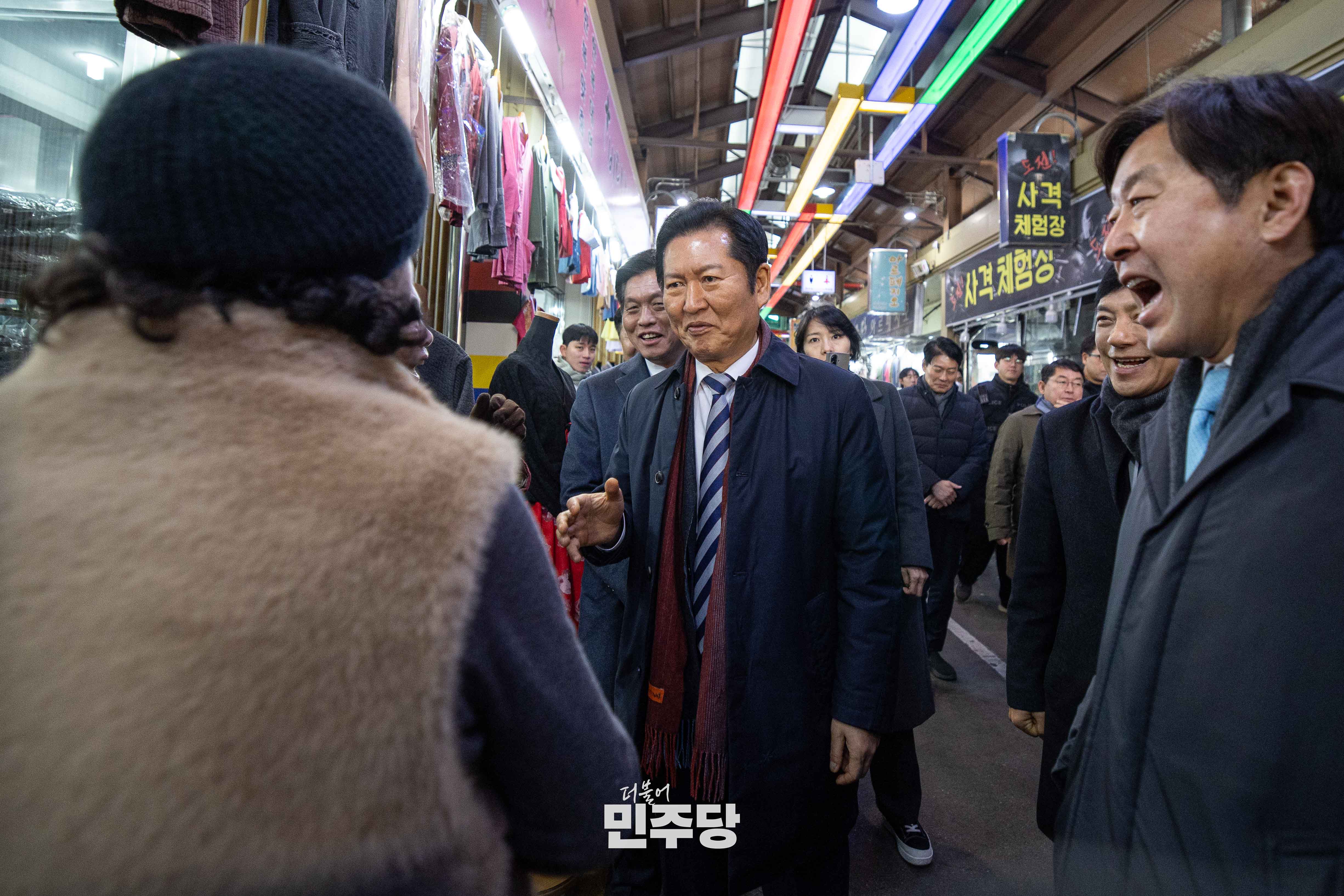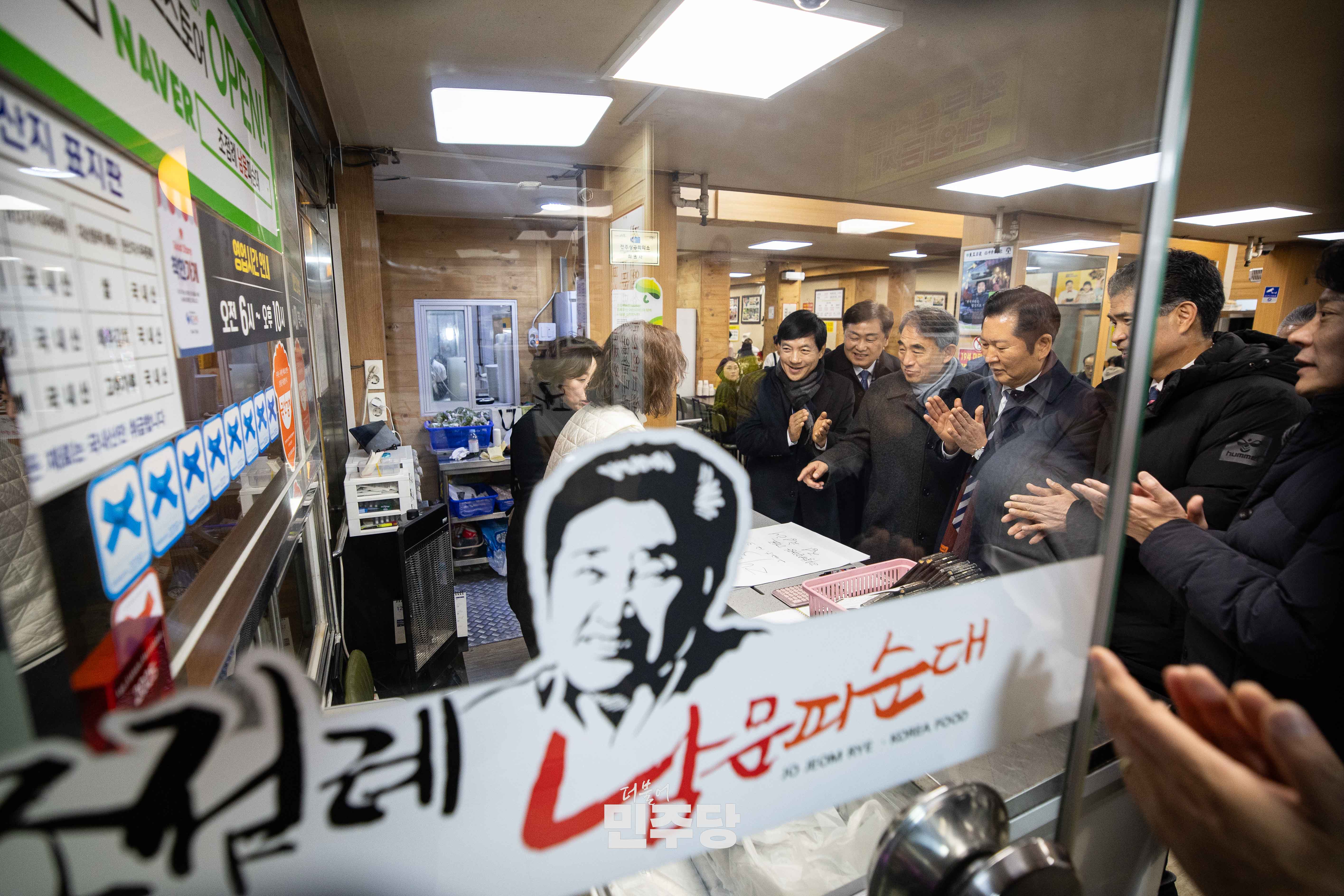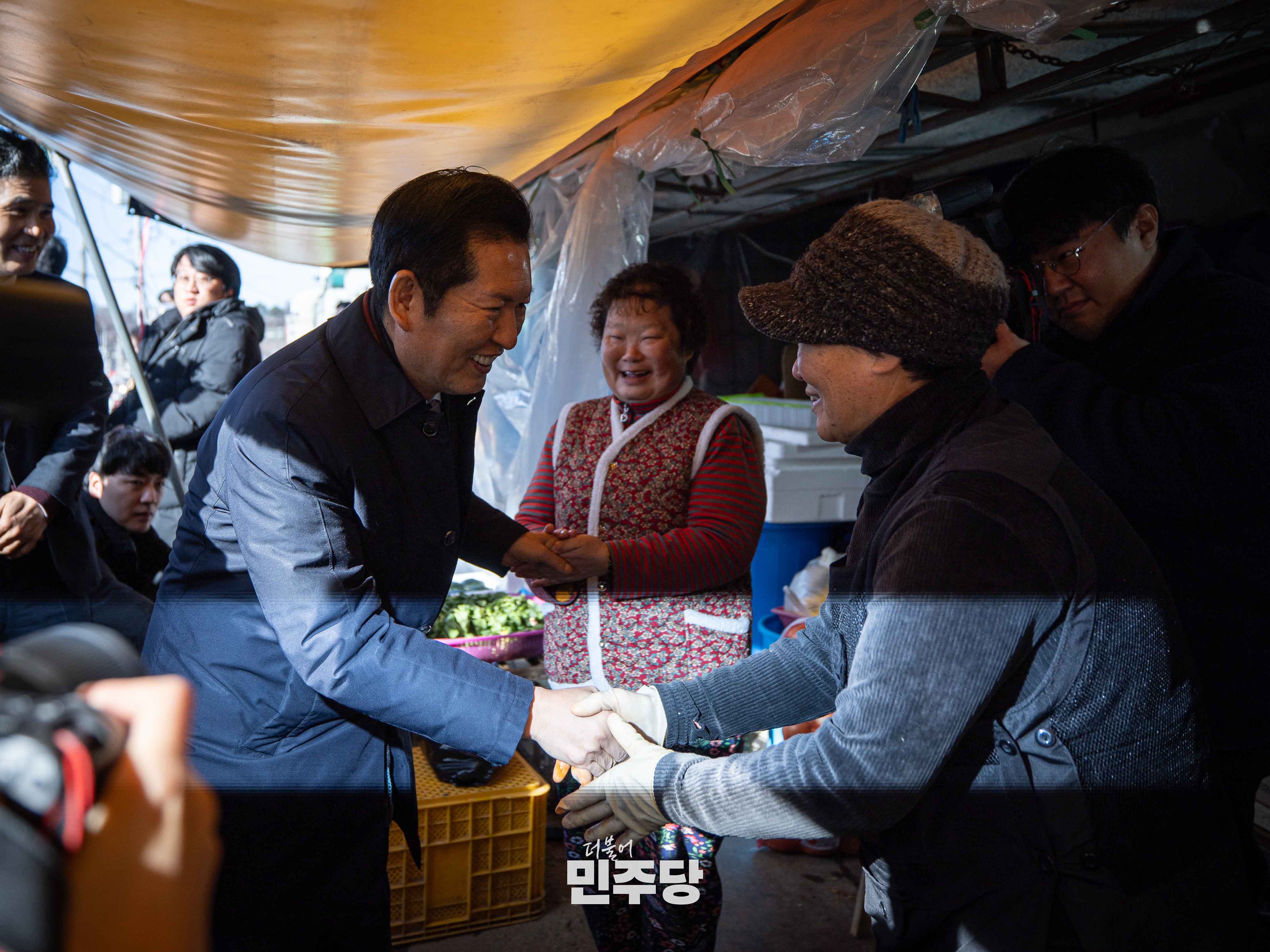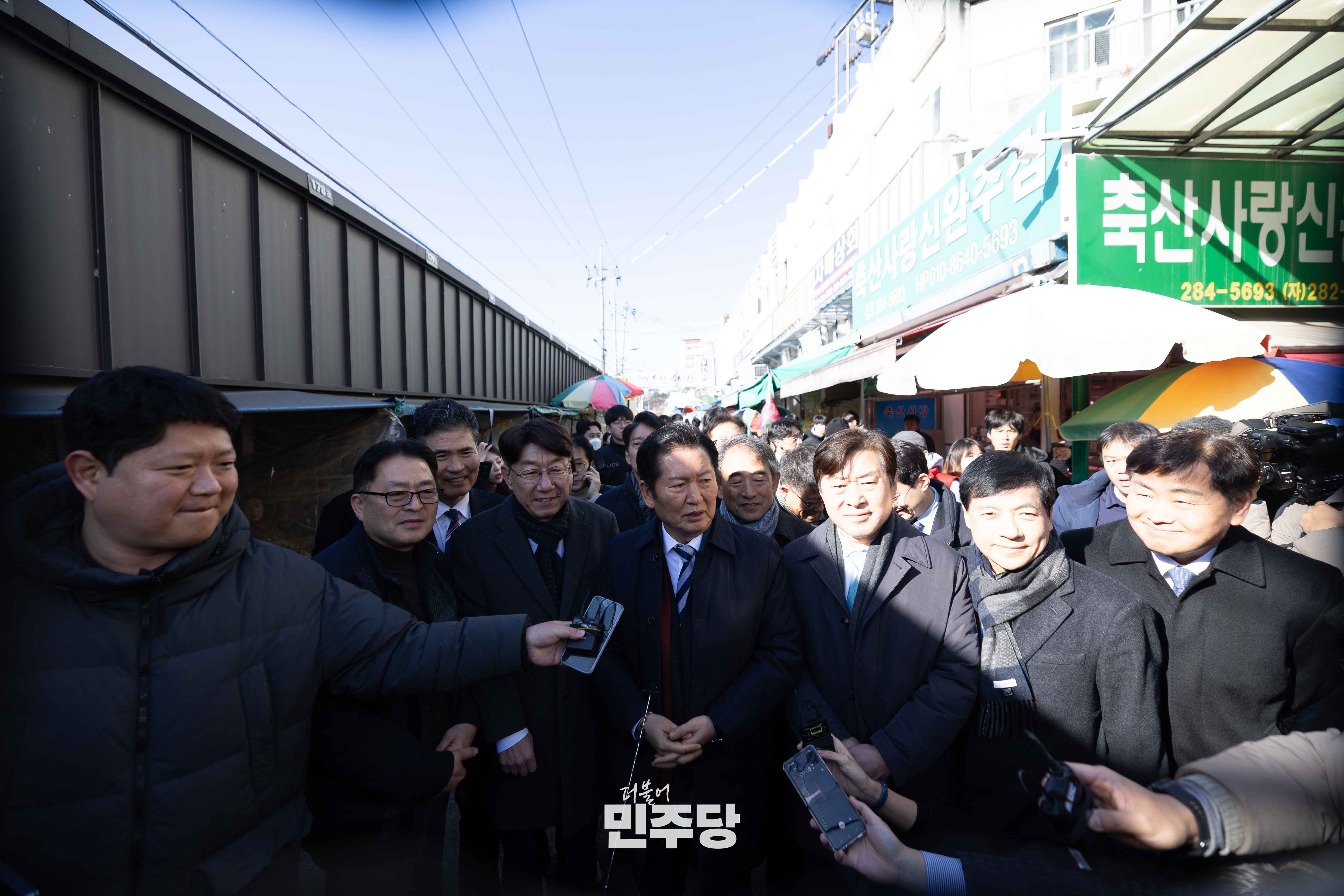 정청래 당대표가 2025.12.31.(수) 전북 전주시에 위치한 남부시장에 방문하여 시장을 방문한 이용객들과 인사를 나누고 있다.