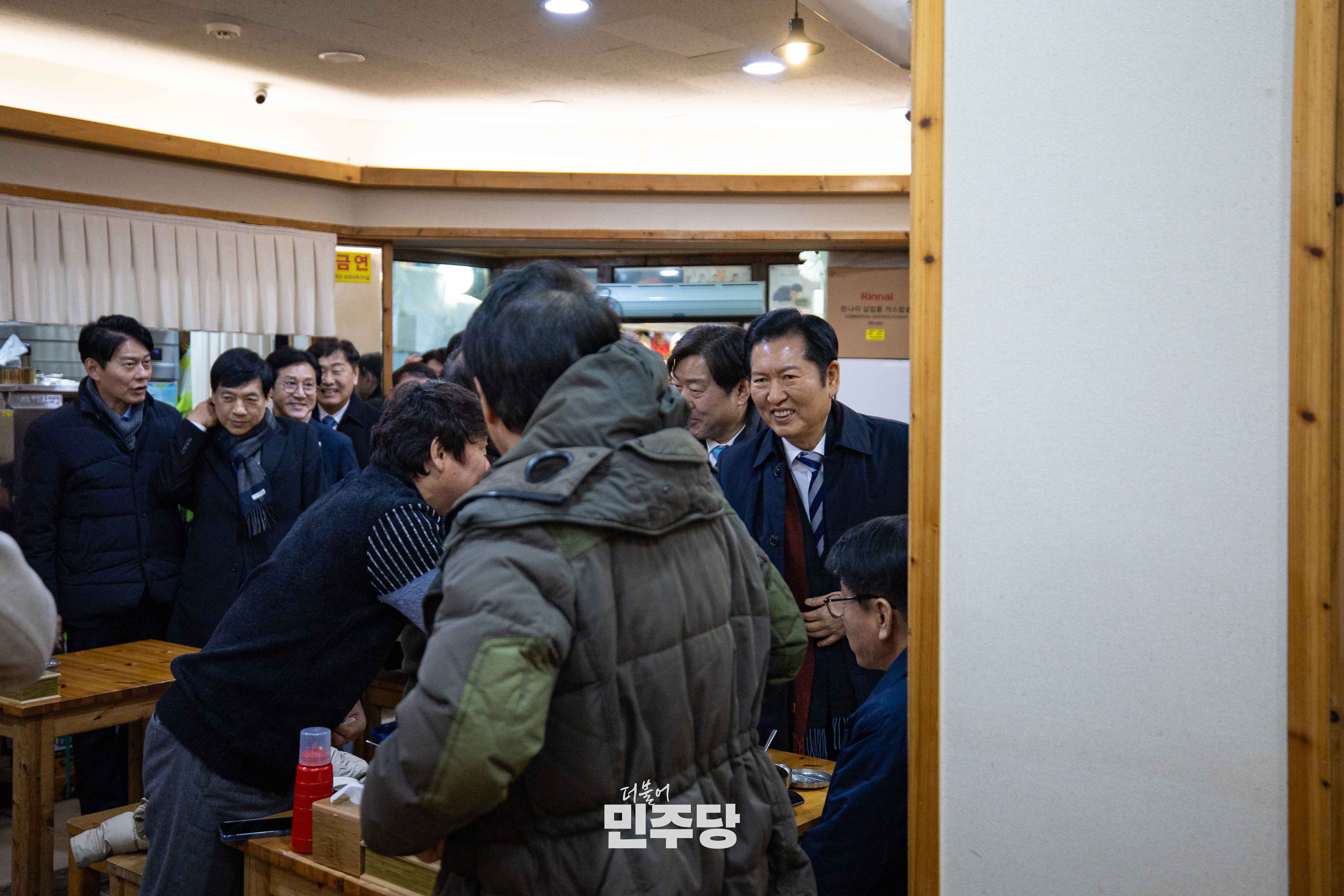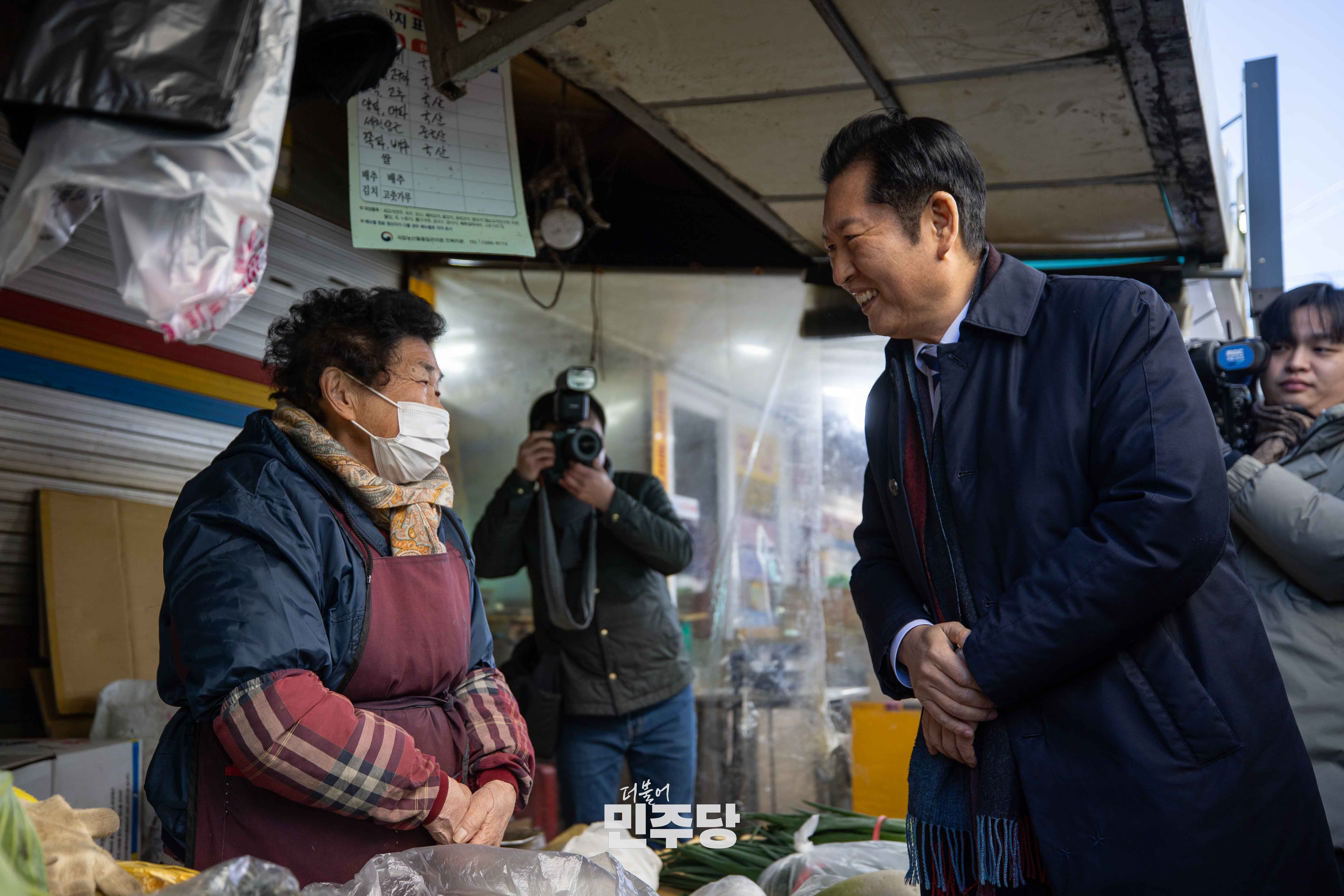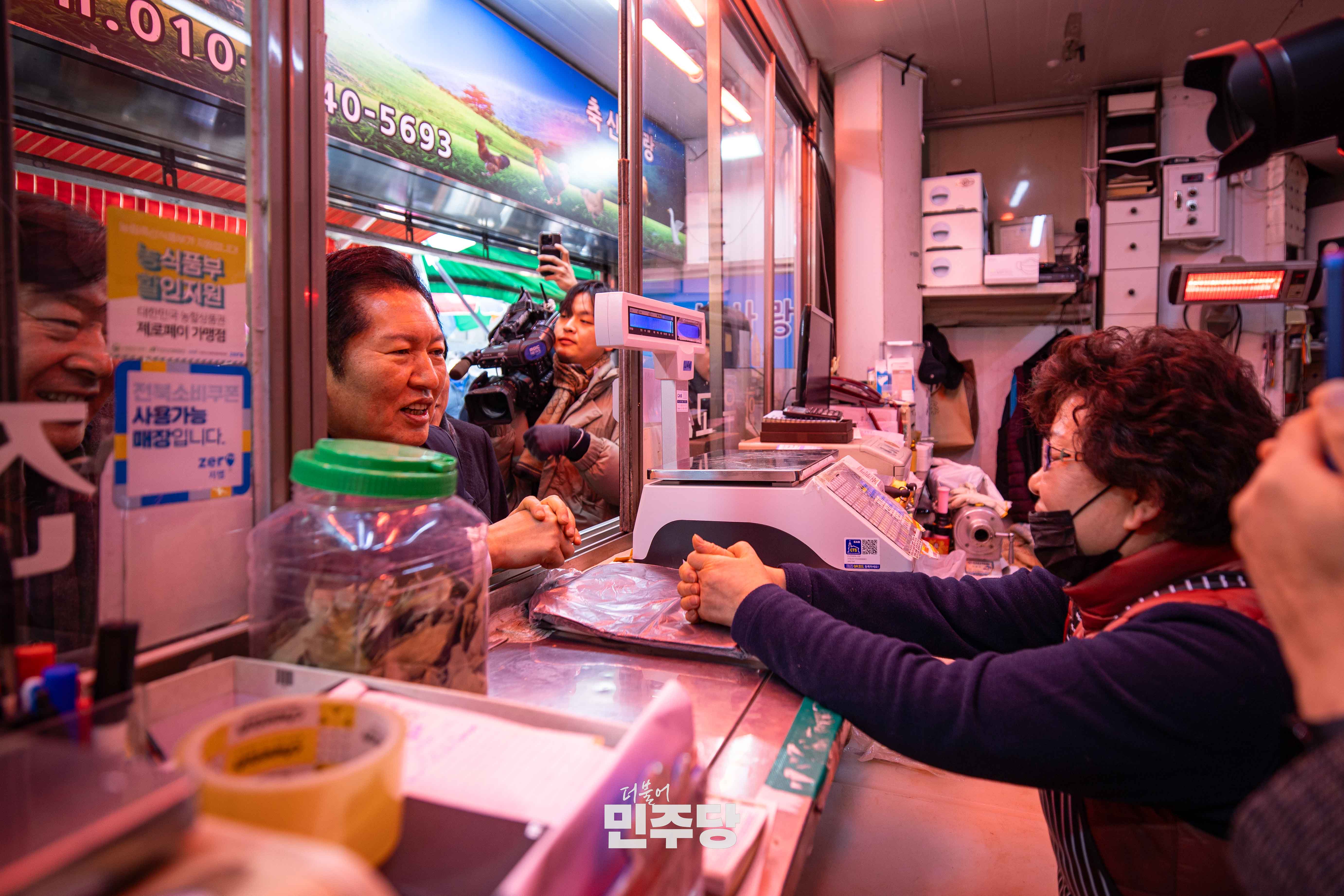 정청래 당대표가 2025.12.31.(수) 전북 전주시에 위치한 남부시장에 방문하여 시장을 방문한 이용객들과 인사를 나누고 있다.