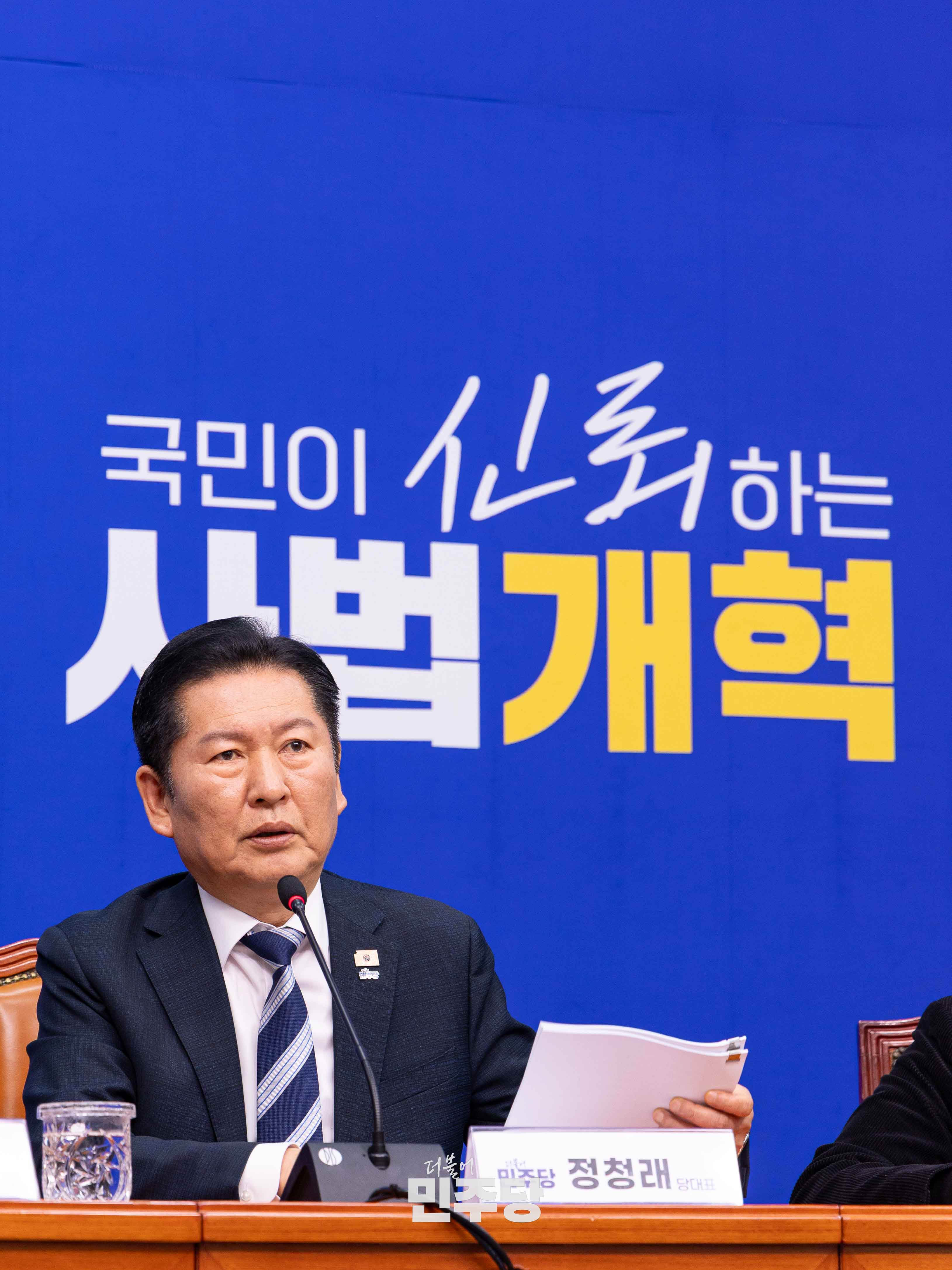 정청래 당대표가 2026.03.24.(화) 국회 본청 당대표회의실에서 열린 착!붙 공약 프로젝트 런칭 행사에 참석하여 발언을 하고 있다.