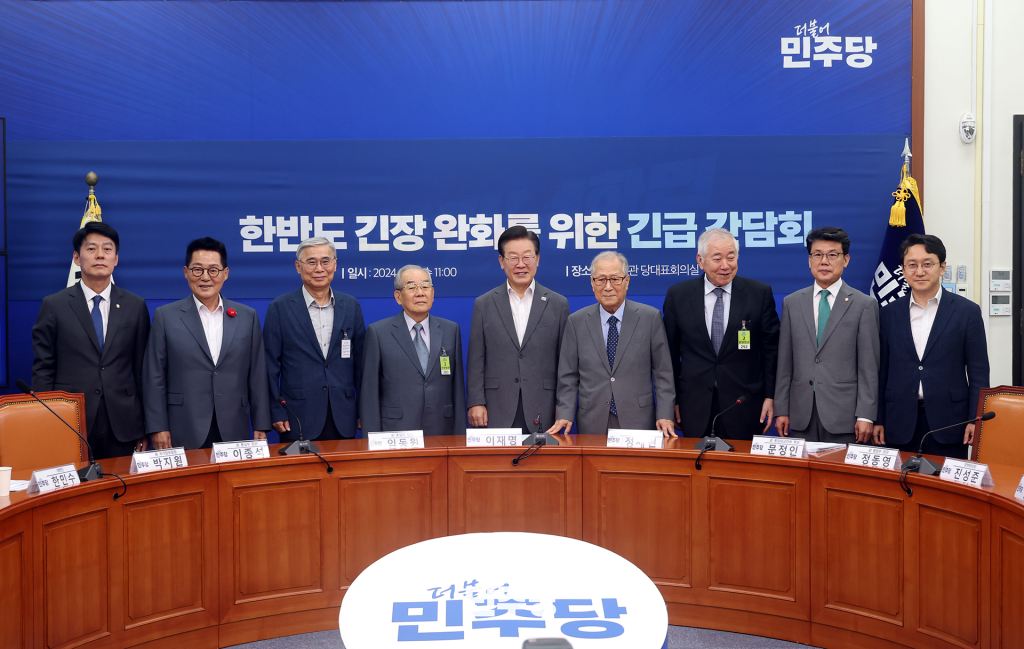 이재명 당대표가 2024.06.19.(수) 국회 본청 당대표회의실에서 열린 한반도 긴장 완화를 위한 긴급 간담회에 참석하여 기념촬영을 하고 있다.