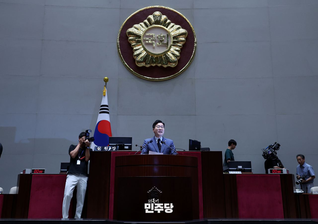 박찬대 당대표 직무대행 및 원내대표가 2024.07.13.(토) 서울 중구 광화문광장 이순신 동상 앞에서 열린 채해병 특검법, 민생개혁 입법 즉각수용 범국민대회에 참석하여 규탄발언을 하고 있다.
