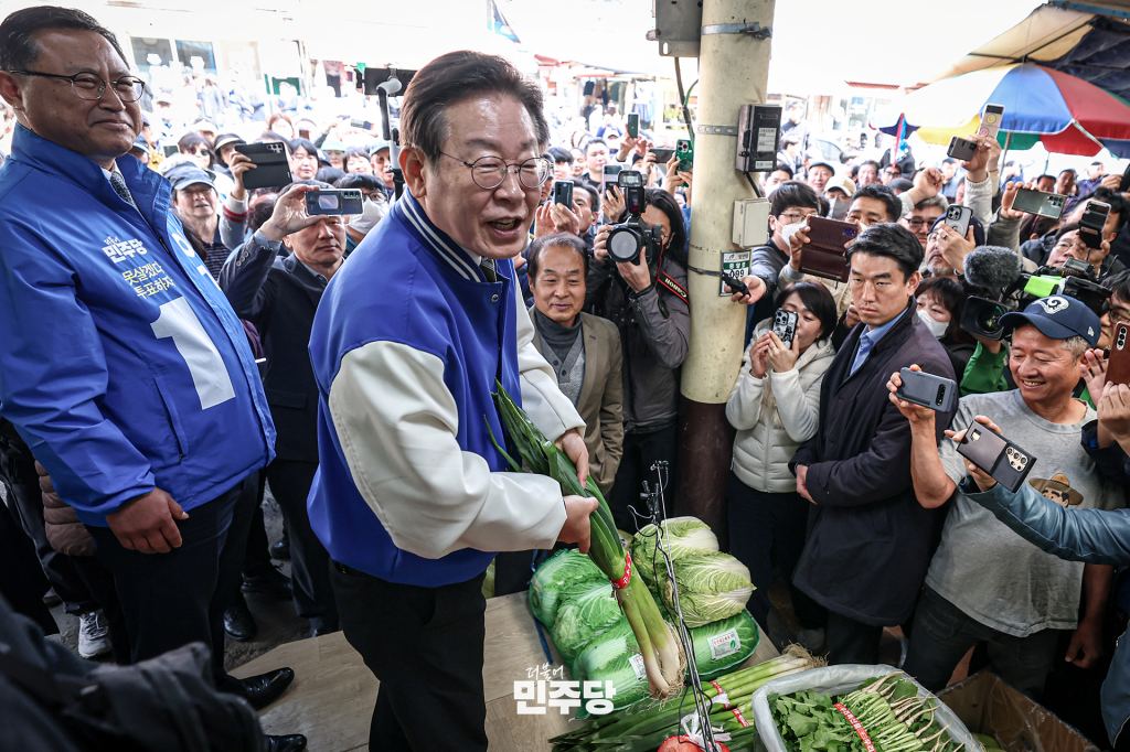 이재명 상임선대위원장이 2024.03.27.(수) 충북 제천에 위치한 제천 동문시장 및 내토전통시장을 방문하여 시장 상인들께 인사를 드리고 있다.