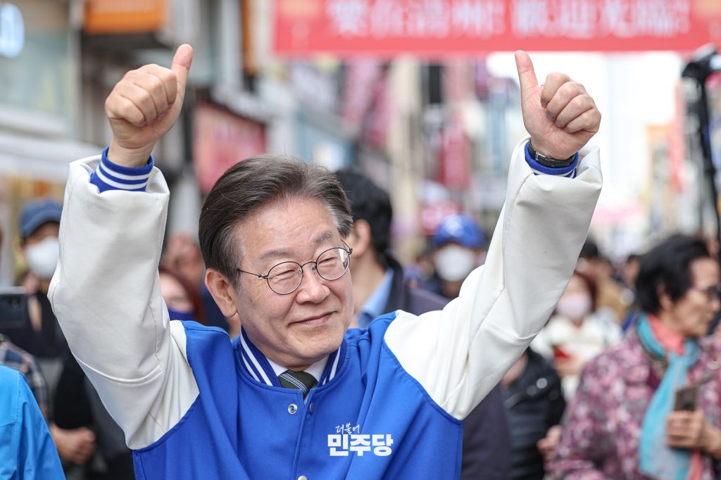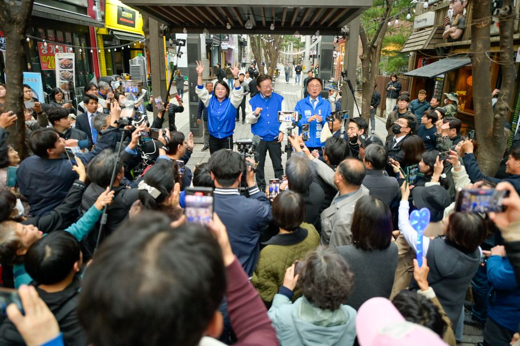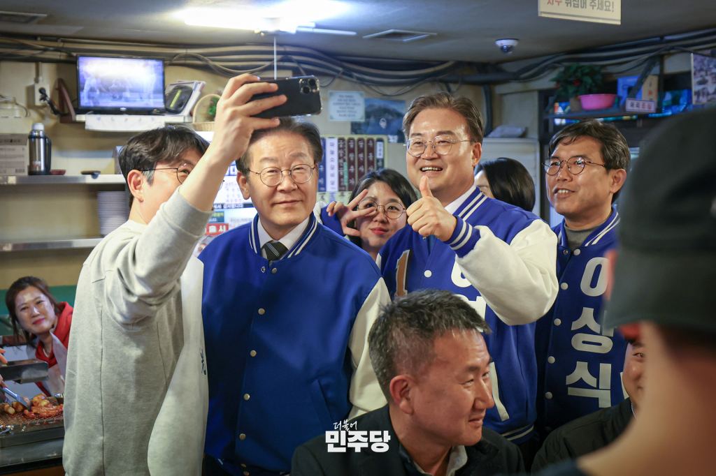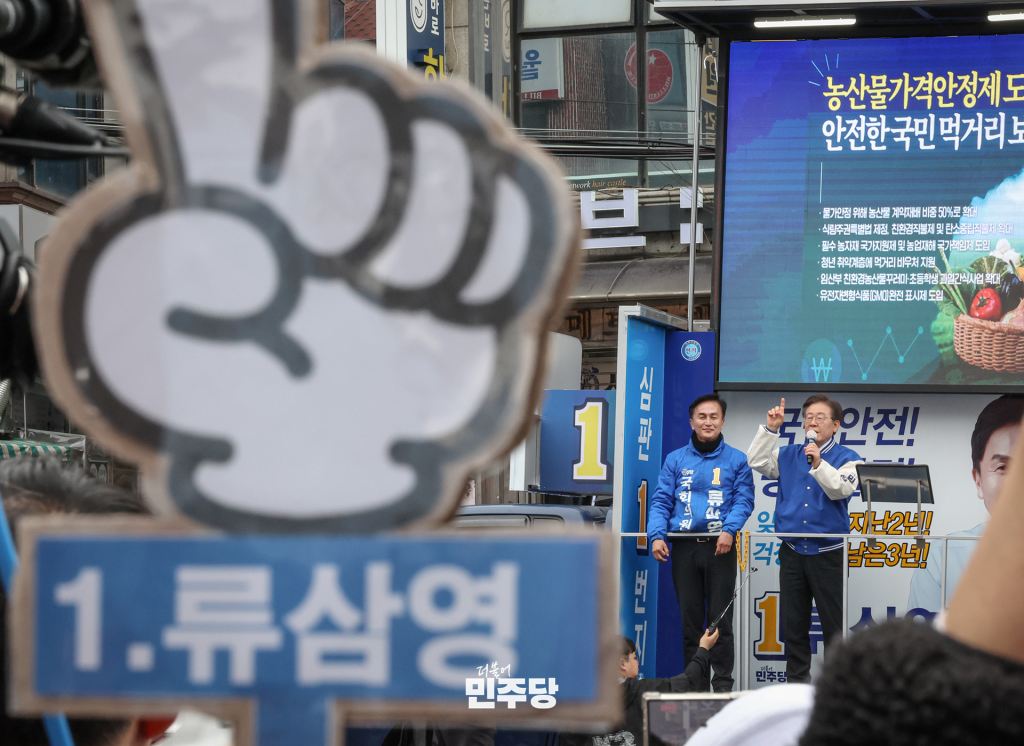 이재명 상임선대위원장이 2024.03.28.(목) 서울 동작구에 위치한 남성골목시장에 방문하여 류삼영 후보 지지 유세를 하고 있다.