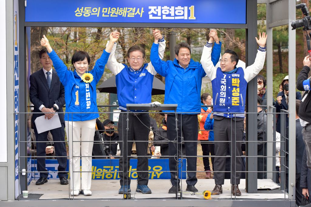 이재명 상임선대위원장이 2024.03.28.(목) 서울 중구에 위치한 왕십리역 부근 공원에서 서울 중구 성동갑 전현희 후보 지지유세를 하고 있다.