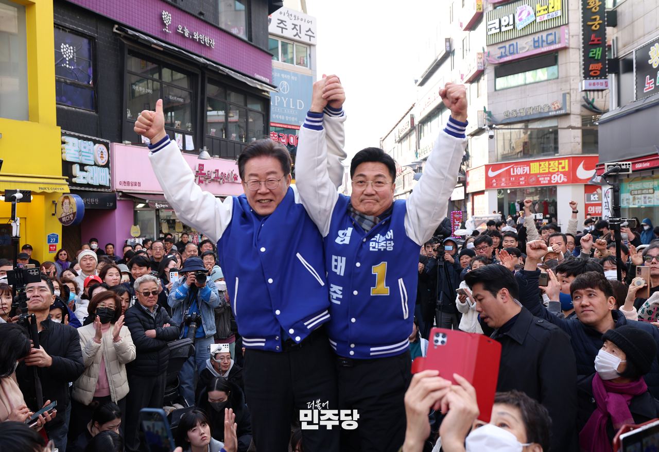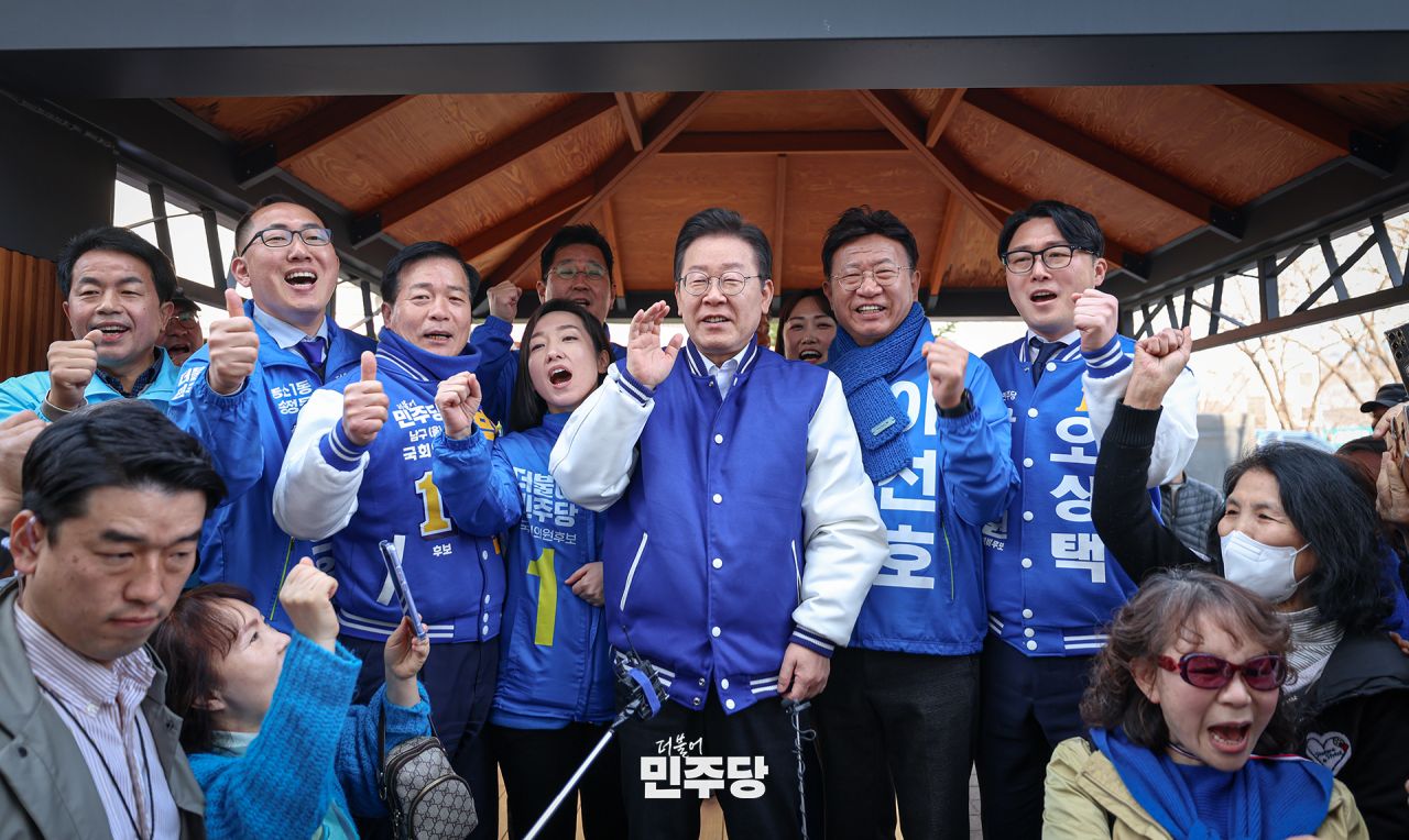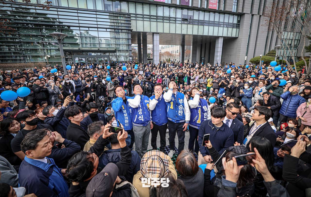 이재명 상임선대위원장이 2024.03.16.(토) 용인 수지구청역 인근 거리에서 시민들에게 인사를 건네고 구청 앞 광장에서 현장 기자회견을 마무리하며 후보자들과 "입틀막" 퍼포먼스를 하고 있다.