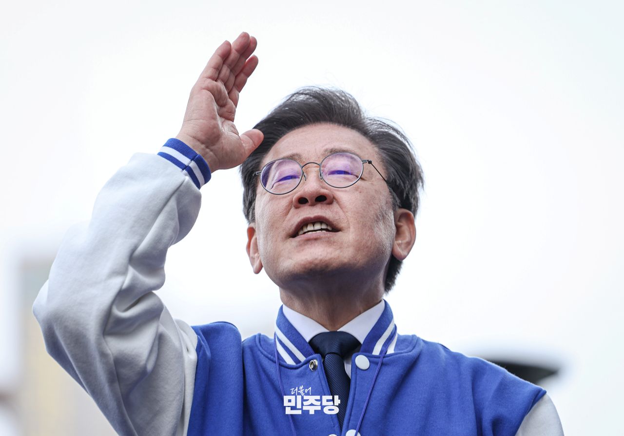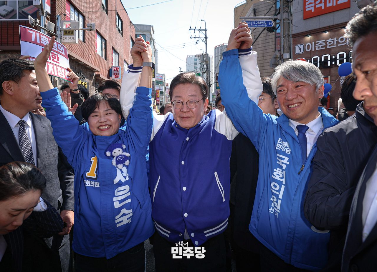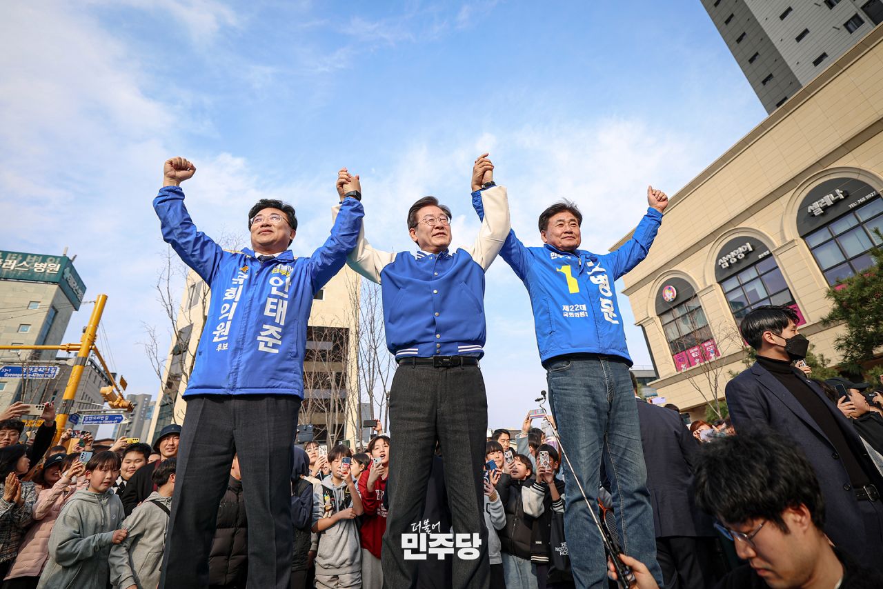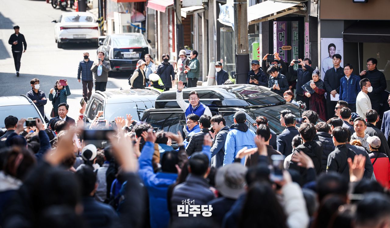 이재명 상임선대위원장이 2024.04.06.(토) 경기 김포시에서 김포시을 박상혁 후보 지지유세를 하고 있다.