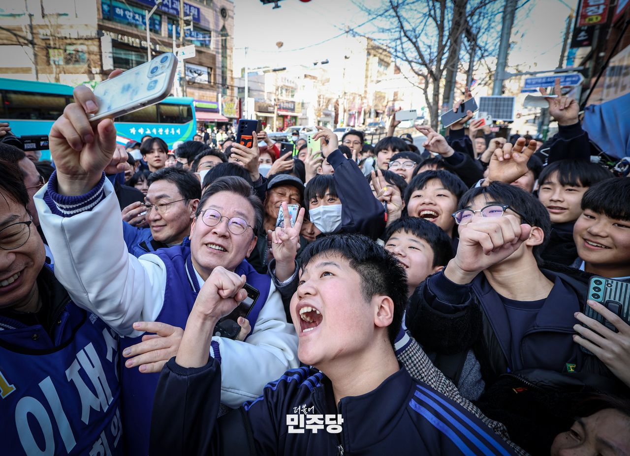 이재명 상임선대위원장이 2024.03.14.(목) 청주시 서원구에 위치한 충북대학교 거리에 방문하여 충북대 중문 거리인사 및 충북 현장 기자회견을 하고 있다.