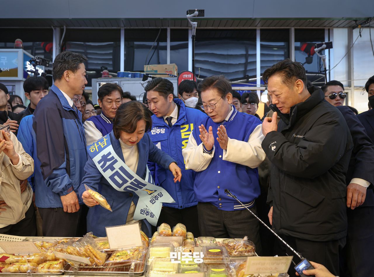 이재명 상임선대위원장이 2024.03.16.(토) 경기 하남시에 위치한 신장시장 앞에서 현장 기자회견을 한 뒤 시장에 방문하여 후보들과 오찬을 하고 있다.