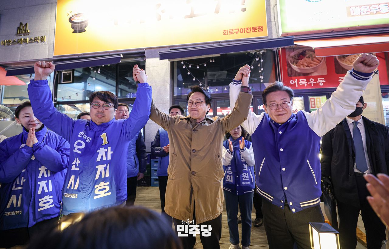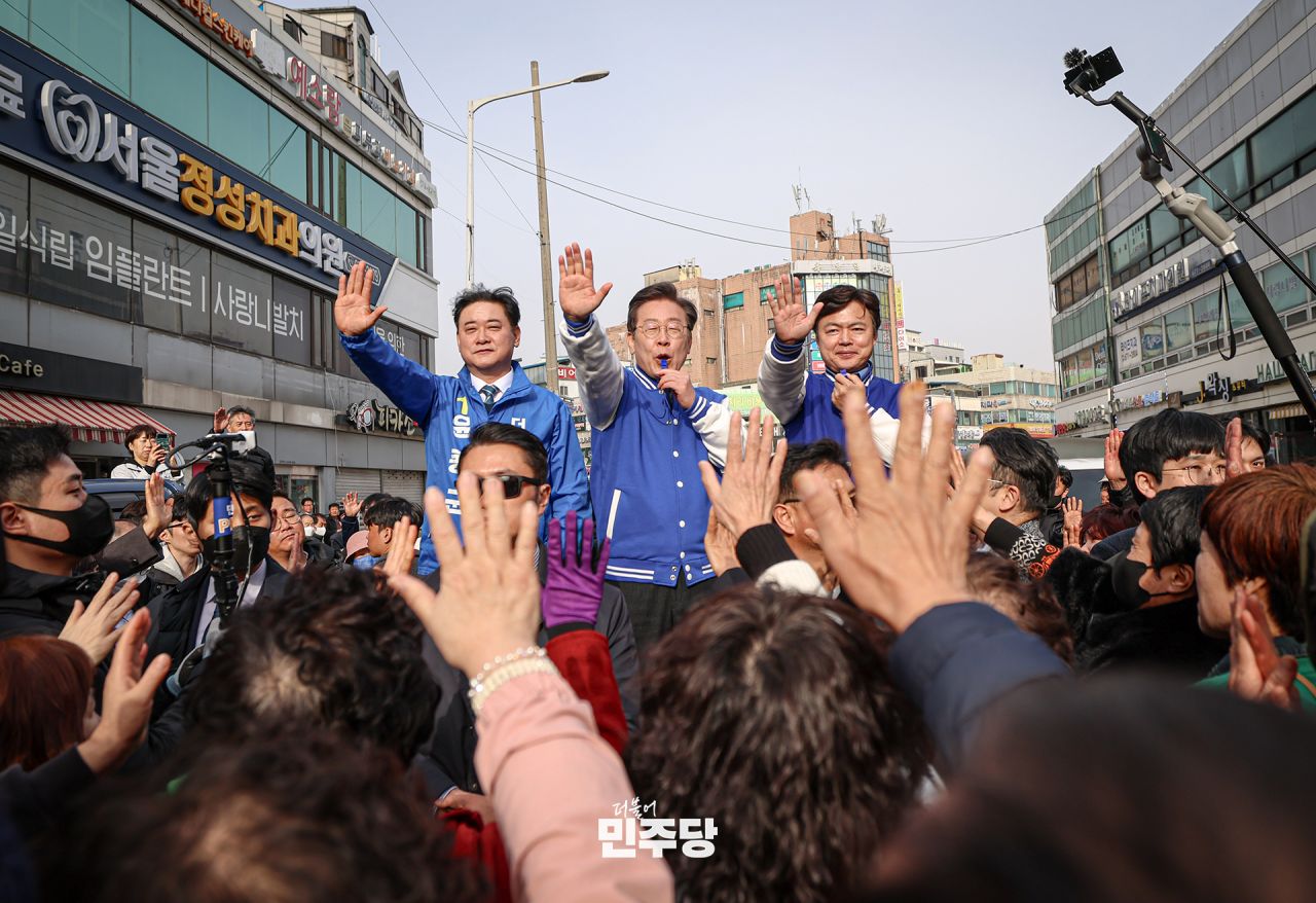 이재명 상임선대위원장이 2024.03.17.(일) 경기 오산시에 위치한 세교 오산대역 중심상가에 방문하여 연설을 한 뒤 거리인사를 나누고 있다.