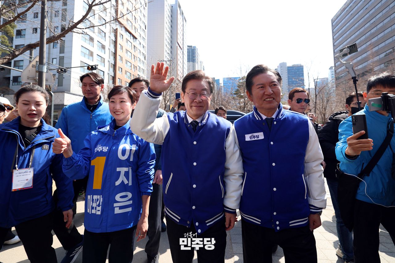 이재명 상임선대위원장이 2024.03.18.(월) 서울 마포구에 위치한 경의선숲길에서 서울 마포 현장 기자회견 및 거리인사를 하고 있다.