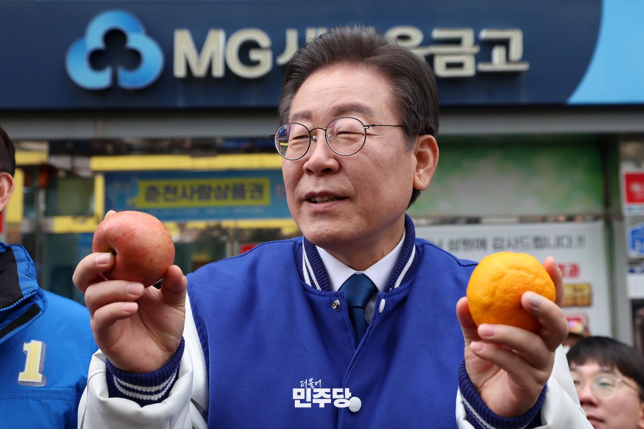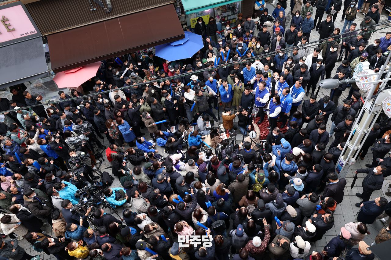 이재명 상임선대위원장이 2024.03.14.(목) 청주시 상당구에 위치한 육거리종합시장에 방문하여 시장 상인들과 인사를 하고 연설을 하고 있다.