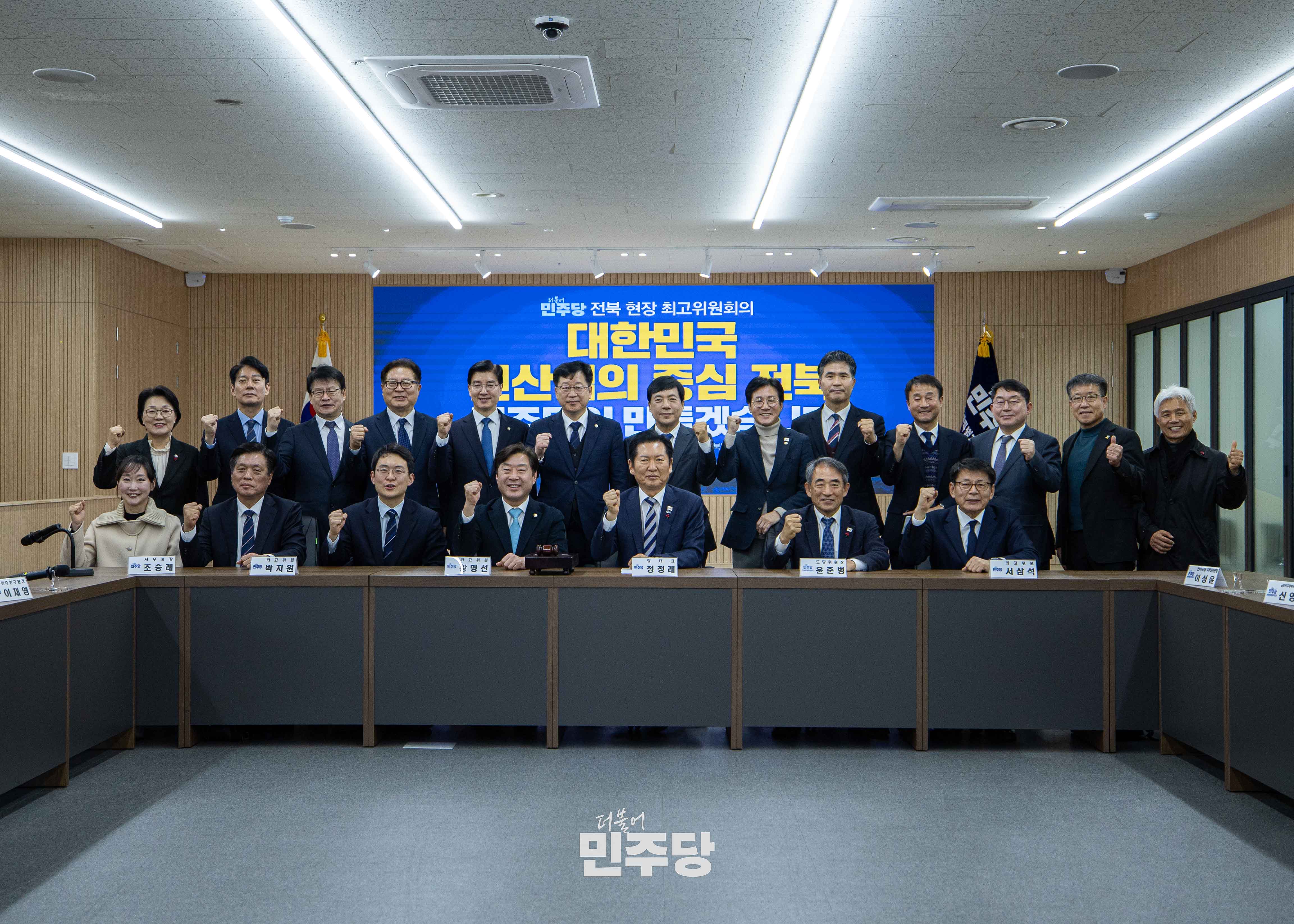 정청래 당대표가 2025.12.24.(수) 국회 본청 당대표회의실에서 열린 대전 충남 통합 및 충청지역 발전 특별위원회 제1차 전체회의에 참석하여 기념촬영을 하고 있다.