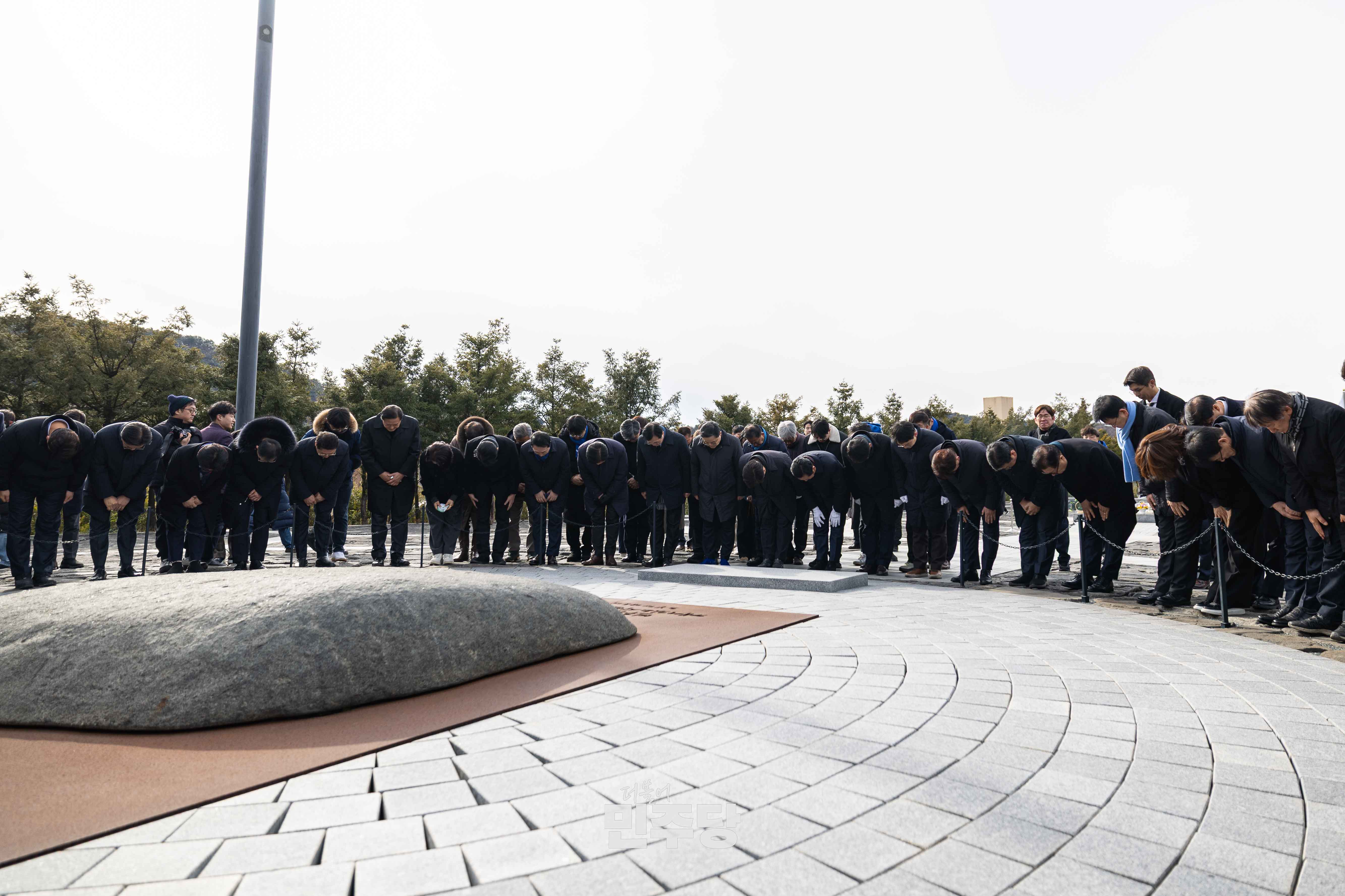 정청래 당대표 및 지도부가 2026.01.01.(목) 경남 김해 봉하마을에서 노무현 前 대통령묘역에 참배를 하고 있다.