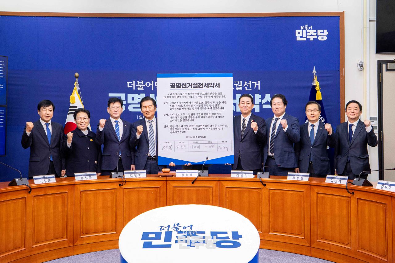 정청래 당대표가 2025.12.19.(금) 국회 본청 당대표회의실에서 열린 공명선거실천서약식에 참석하여 최고위원 보궐선거 후보자들과 기념촬영을 하고 있다.