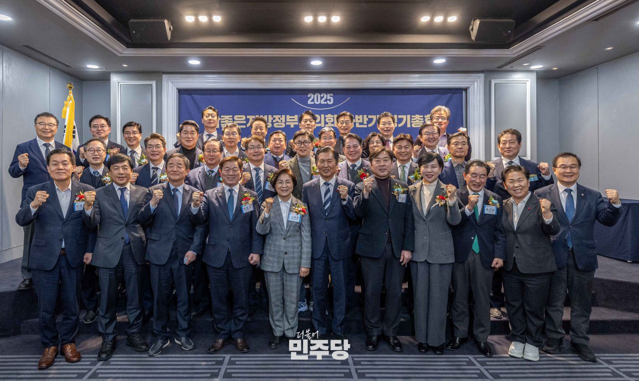 정청래 당대표가 2025.12.22.(화) 여의도 켄싱턴호텔에서 열린 참좋은지방정부협의회 하반기 정기총회에 참석하여 기념촬영을 하고 있다.