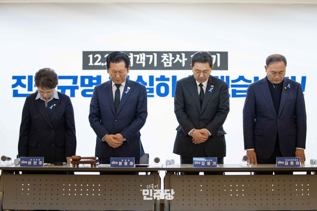 정청래 당대표가 2025.12.29.(월) 전남 무안군에 위치한 승달예술회관에서 전남 현장최고위원회의에 참석하여 09시03분에 울린 12.29 여객기 참사 1주기를 추모하는 사이렌에 맞춰 추모를 하고 있다.