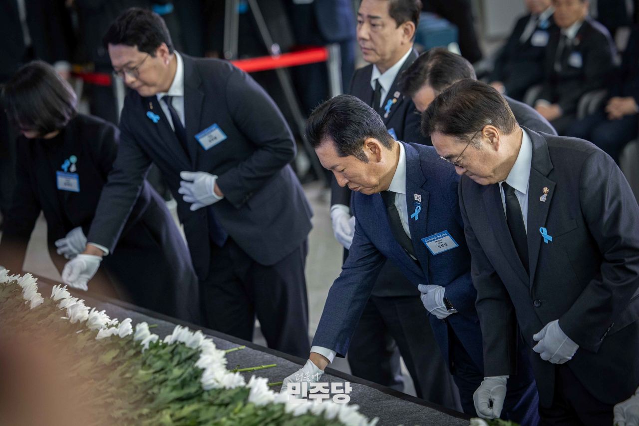 정청래 당대표가 2025.12.29.(월) 전남 무안군에 위치한 무안국제공항에서 진행된 12.29 여객기 참사 1주기 추모식에 참석하여 헌화를 하고 있다.