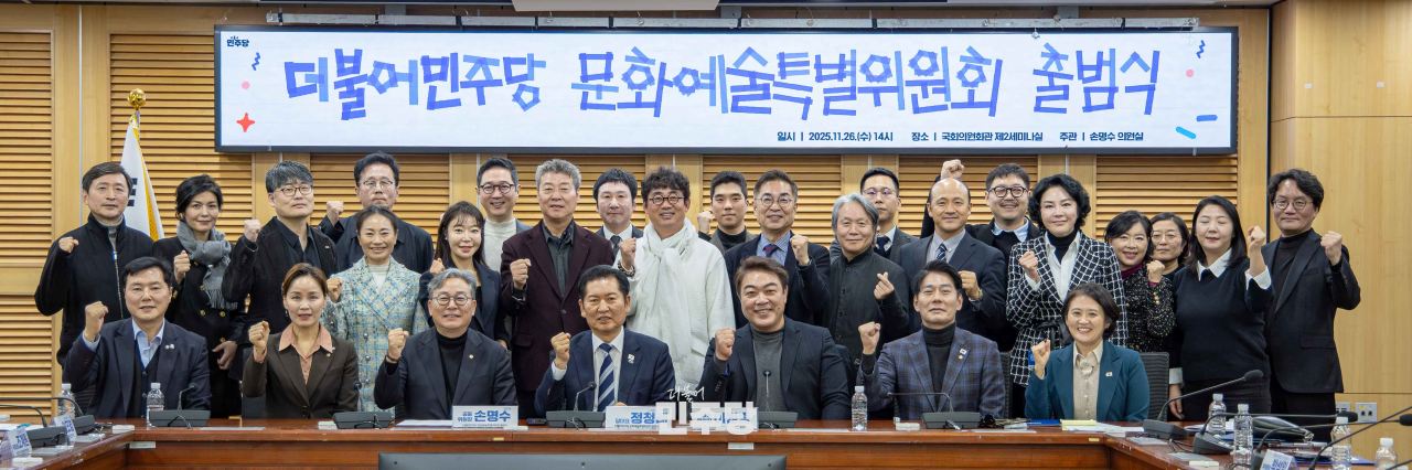 정청래 당대표가 2025.11.26.(수) 국회 의원회관 제2세미나실에서 열린 문화예술특별위원회 출범식에 참석하여 기념촬영을 하고 있다.