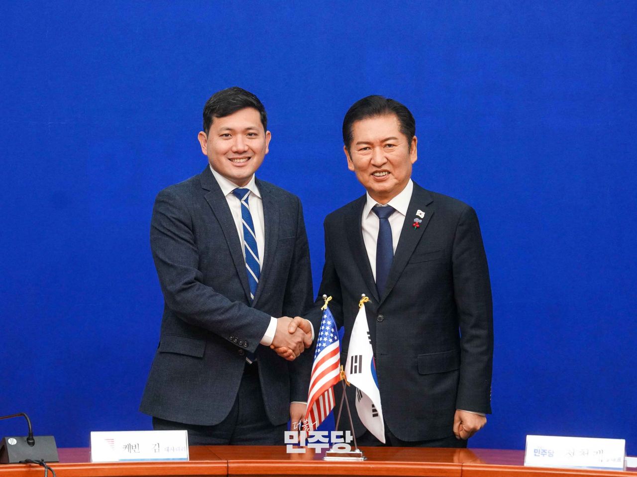 정청래 당대표가 2025.12.02.(화) 국회 본청 당대표회의실에 예방한 케빈 김 주한미국대사대리를 접견하고 기념촬영을 하고 있다.[사진제공 강선우의원실]