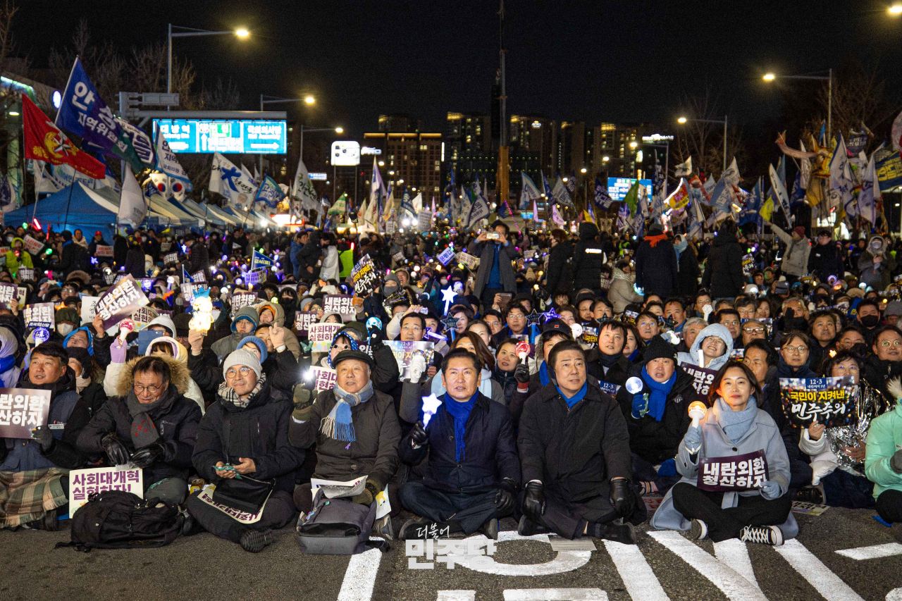 정청래 당대표가 2025.12.03.(수) 국회 앞 대로에서 열린 12.3 내란외환 청산과 종식, 사회대개혁 시민대행진에 참석하여 구호를 외치고 있다.
