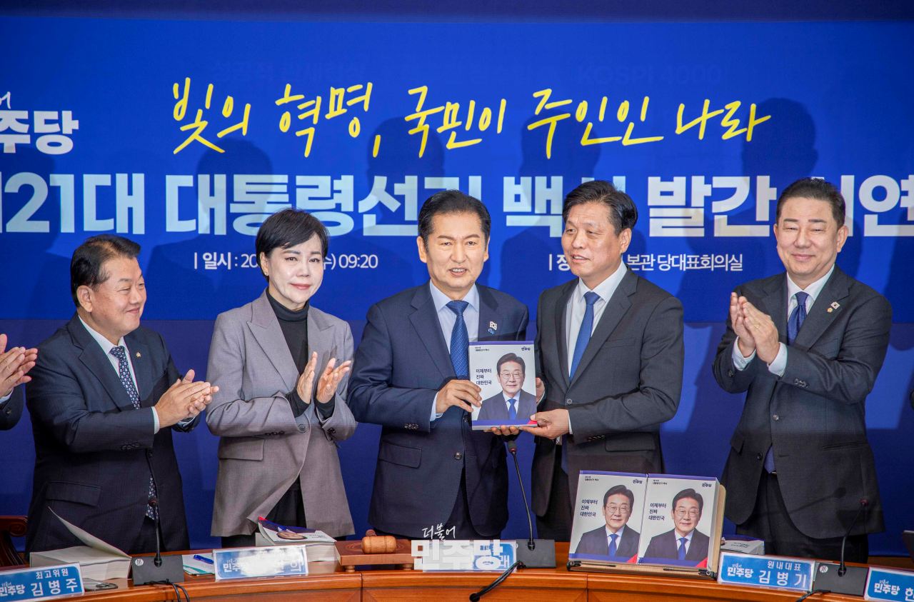 정청래 당대표가 2025.11.05.(수) 국회 본청 당대표회의실에서 진행된 제21대 대통령선거 백서 발간 시연회에 참석하여 기념촬영을 하고 있다.