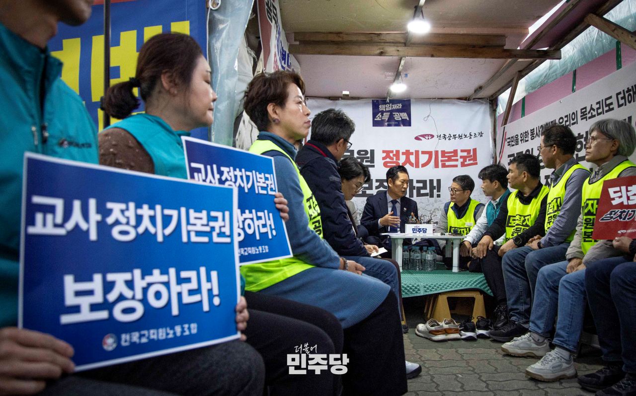 정청래 당대표가 2025.11.05.(수) 국회 앞에 위치한 공무원노조 농성장에 방문하여 간담회를 하고 있다.