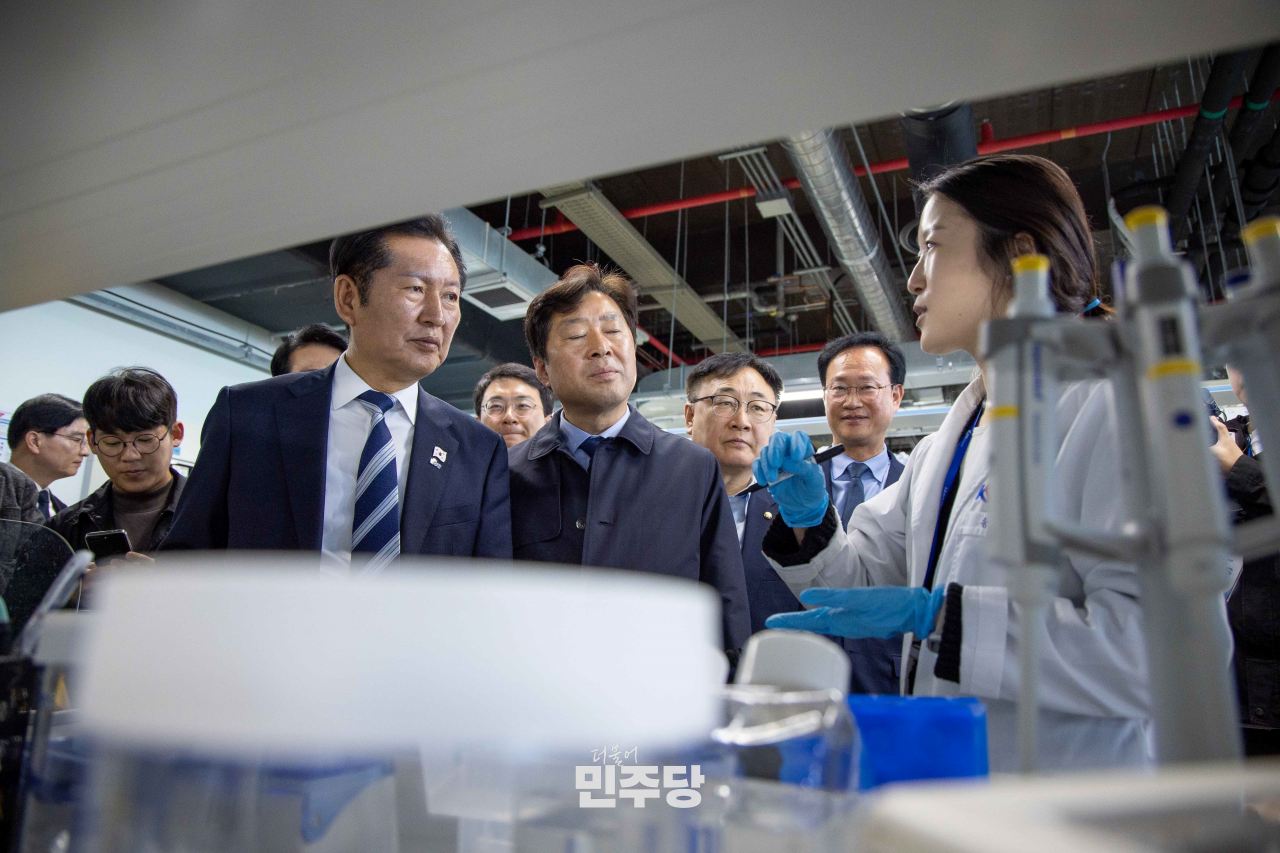 정청래 당대표가 2025.11.07.(금) 충북 청주시에 위치한 오송첨단의료산업진흥재단에 방문하여 K-바이오 세계 도약을 위한 현장 간담회를 가지고 있다.